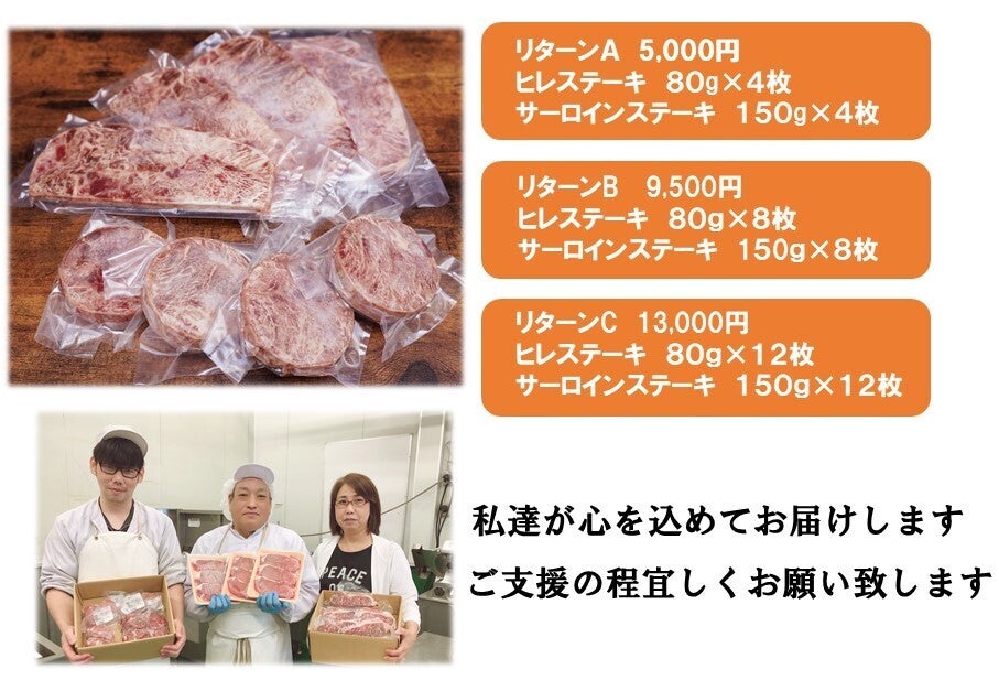 ご支援の御礼品(リターン品)として牛肉のやわらかヒレ・サーロインをステーキサイズに加工して、皆様のご家庭へヤマト・佐川クール便でお届けいたします。ご家庭でやわらか牛肉ステーキをお召し上がりください。