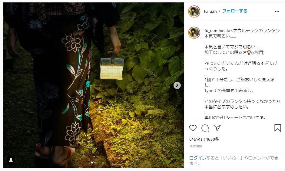 皆様こんにちは!hinataプロジェクトです。皆様からのご支援を頂きありがとうございます。キャンパー女子の森 風美さんからインスタのポストを頂きました。森 風美さんと言えば、インスタ、Twitterはもちろん、TVや雑誌、トークショーに大活躍されています。インスタには、本気と書いてマジで明るい・・・とレビュー頂きました。森さん、ありがとうございます!先日、釣り番組にも出演された森さん。千葉勝浦のキャンプ場をベースに食材を釣って料理するという内容で、釣りも上手で「イワシ、サバ」を釣り上げ美味しそうなお料理の品々を作ってらっしゃいました!私も料理好きなので、次回は是非自分の釣った魚でキャンプ料理作ってみます。https://www.instagram.com/p/CVKuqySPhx-/?utm_medium=copy_link株式会社オウルテック