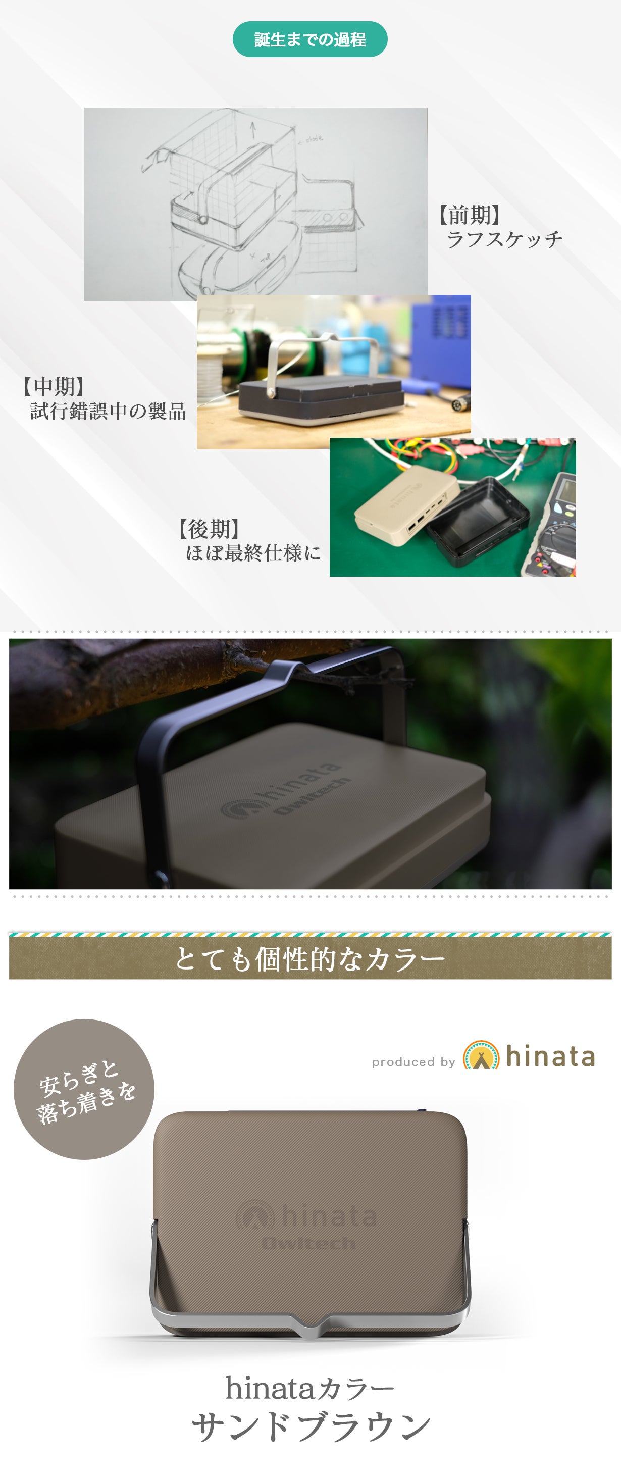 2021/10/22 18:30皆様こんにちは!hinataプロジェクトです。皆様からのご支援を頂きありがとうございます。今回の活動報告は、コネクタ部分の詳細をお伝えします。左からUSB/A 出力ポートが2つType-C 入出力ポートが1つmicroUSB 入力ポートが1つ一番右側が電源や明るさをコントロールするボタンになります。USB/Aポートはケーブルを繋ぐ事でお持ちのスマートフォンに充電が出来ますし、例えばテントで使用している小さなランタンの電池が無くなった場合、hinataランタンから電源を分ける事も出来ます。24000mAhの電池容量なので急場で分け合える安心の大容量です。Type-Cは、入力と出力を1ポートで兼ね備え、且つPD18Wの入出力仕様ですのでhinataランタンへの蓄電、スマートフォンへの充電が急速で行えます。もう一つ、microUSBポートもhinataランタンへの蓄電専用でありますのでお手持ちのケーブル種をあまり気にせず蓄電する事ができます。コネクタキャップも本体に接続されてますので、脱落で紛失の心配がありません。そこも小さな事ですが重要な事として設計に組み込んだ一つです。株式会社オウルテック もっと見る