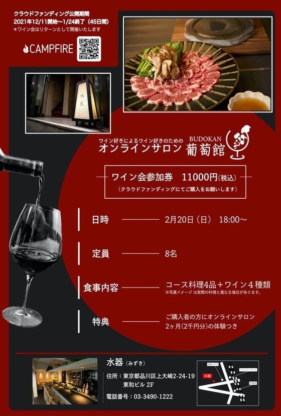 2月20日(日)にこちらのお店でリターンのワイン会開催します。メニューはクラウドファンディング特別メニューです。是非ご参加ください。参加券はリターンよりご購入ください。
