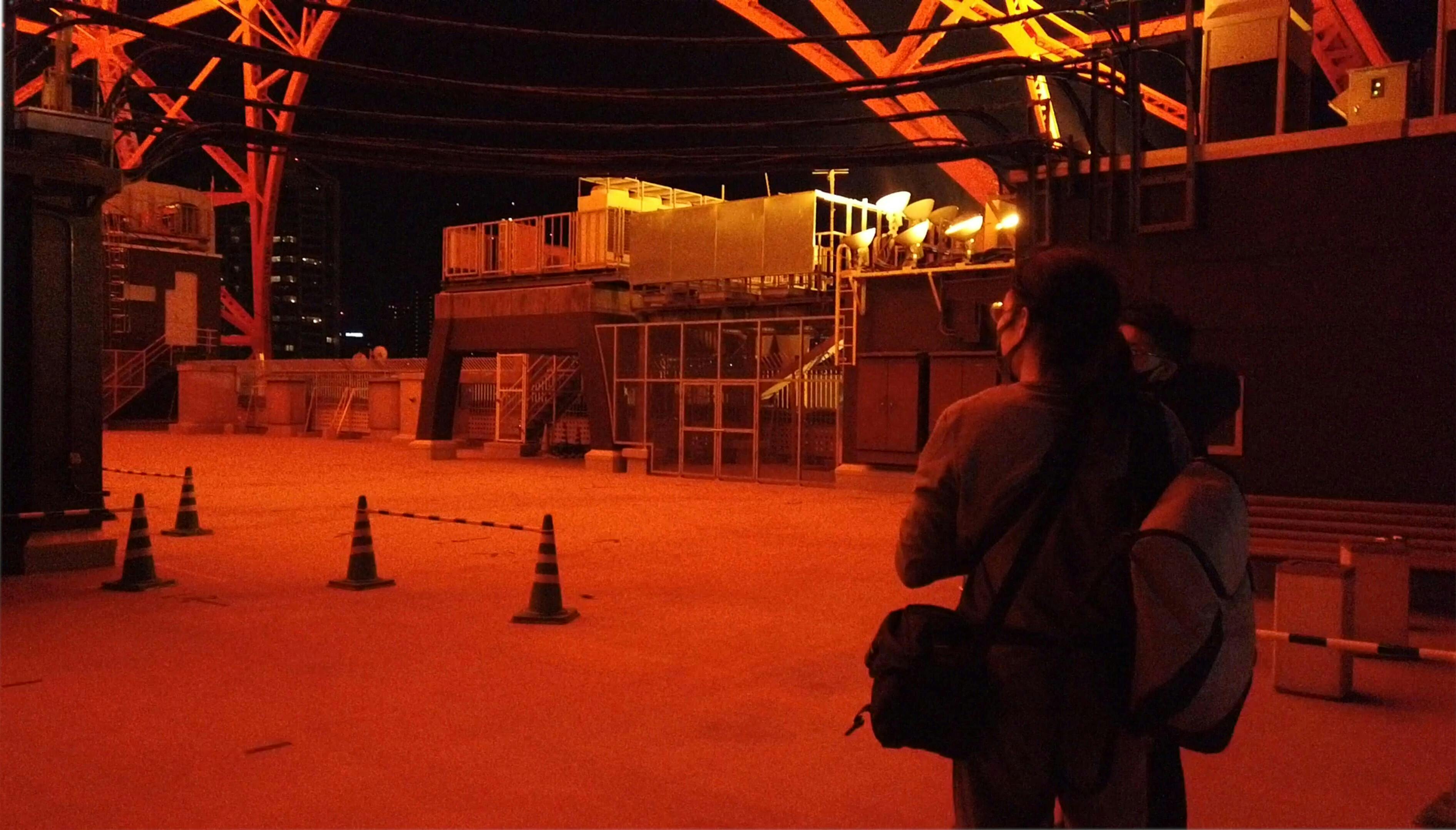 東京タワーの真下にある屋上から東京タワーを見上げる角度で、躍動感のあるSF映画のワンシーンのようなカットを撮影します。