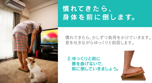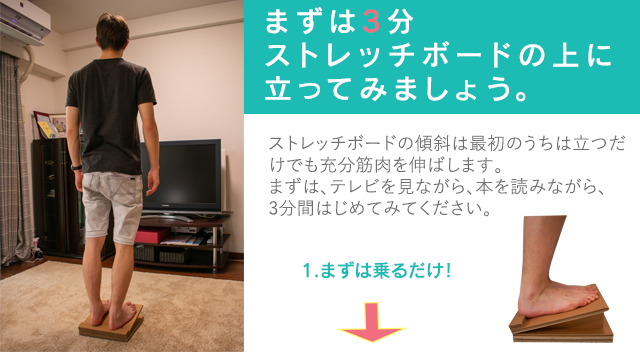 ストレッチボードの傾斜は最初のうちは立つだけでも充分筋肉を伸ばします。