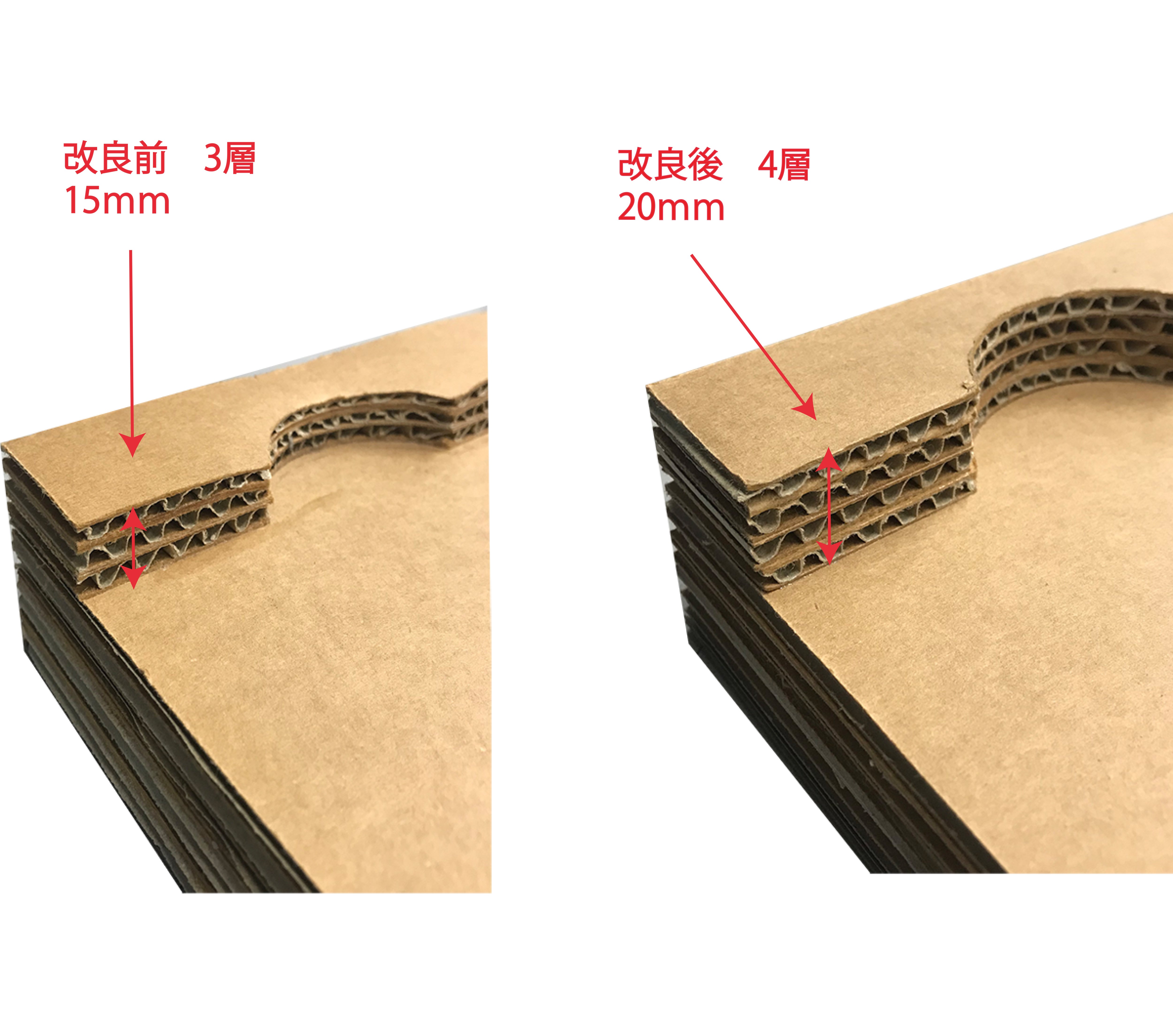 「裸足で乗ると、ダンボールの角が当たって痛い」というお声をいただきましたので、かかと部分のダンボールを一層増やし、角が当たらず、より安定して立てるように改良しています。