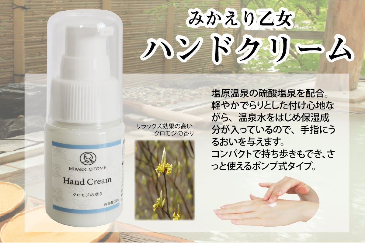 もちろんこの「みかえり乙女洗顔石けん」、「みかえり乙女ハンドクリーム」もこの塩原温泉水を使用して作られていますので、使用後はまるで温泉の湯上りのような”すべすべ&つるつる”の温泉気分をお楽しみいただけます。
