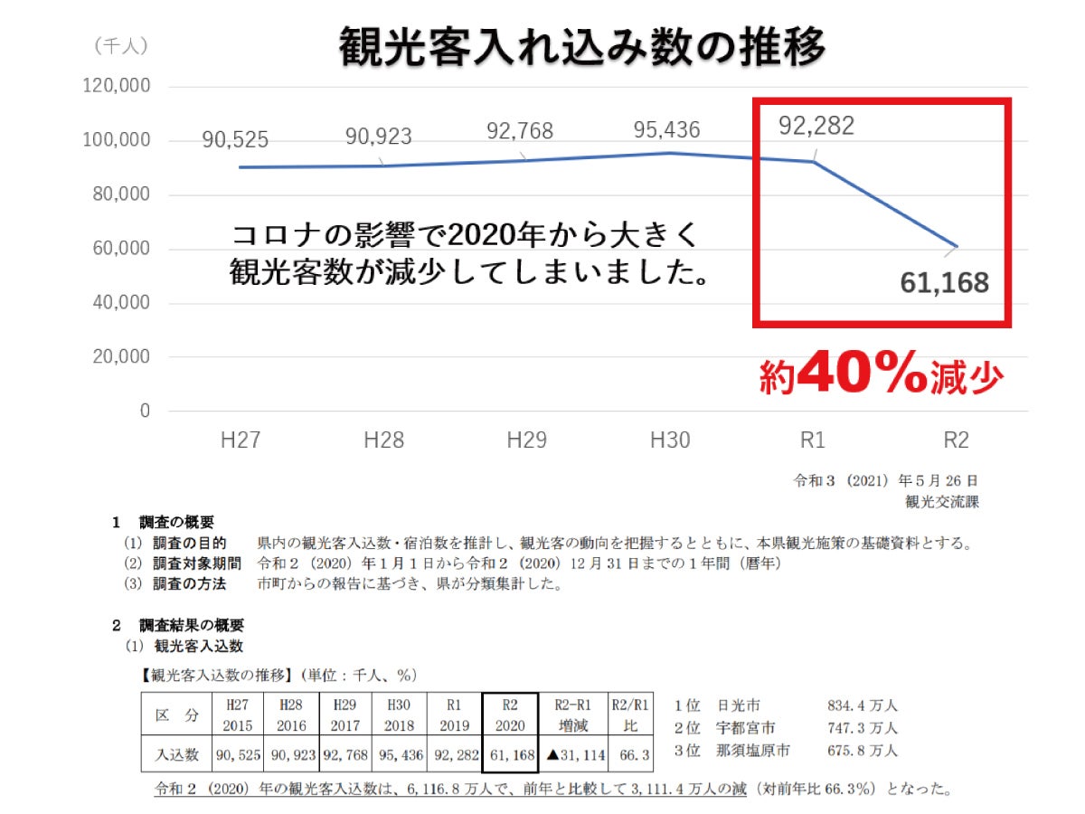 那須塩原市には、塩原温泉、板室温泉の2つの大きな温泉地があり、約900万人/年間の観光客の皆様で賑わう観光地です。しかし2020年から始まったコロナウイルスの影響により観光客の数は大幅に減少。