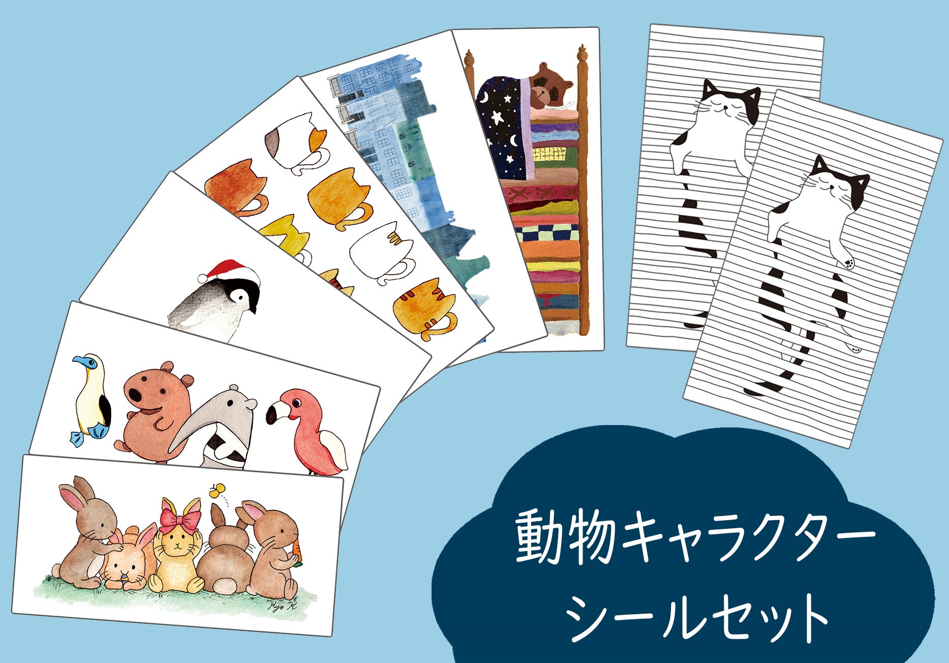 商品に使われている猫のデザイン2枚とランダムな動物キャラクター6枚のシール、計8枚を送ります。
