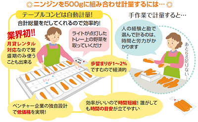 このテーブルコンビを使うことで、ニンジン農家の計量作業時間が半減し、夜なべ作業が改善されました。