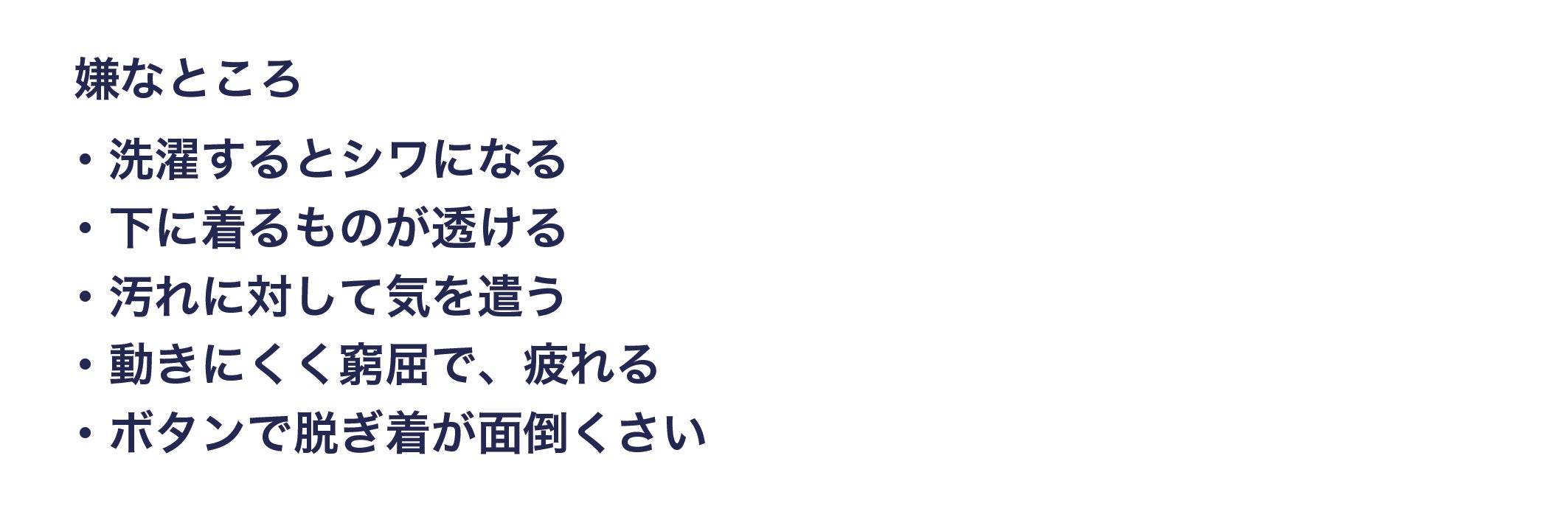 まずは洗濯後のシワ。毎回アイロンをかけるのはとても面倒ですよね。インナーや下着が透けることを気にする必要があるというのも、白シャツのストレスの一つです。次に汚れ問題。白い服の永遠の課題ですよね。そして動きにくさ、堅苦しさやボタンの面倒くささというのも課題として挙がりました。