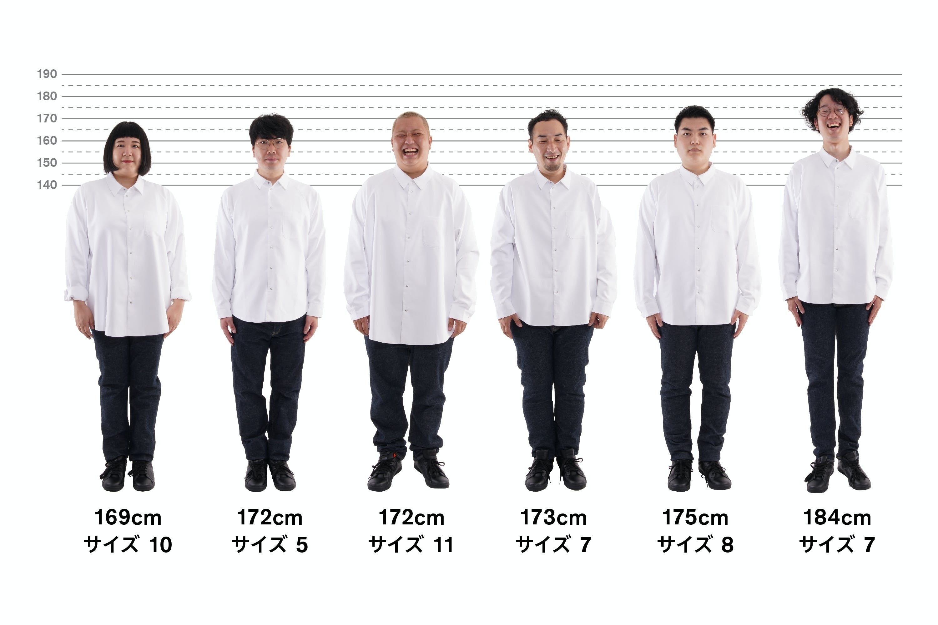 オールユアーズはサイズで人を区別しません。体型に関わらず皆さんに同じ着用体験をしてほしいという思いから、女性のXSサイズ相当~男性の7XLサイズ相当までの全13サイズ、同じ値段で展開しています。参考までに様々な体型の方々(体重40㎏未満の方から120㎏前後の方まで)に実際に着ていただきました。
