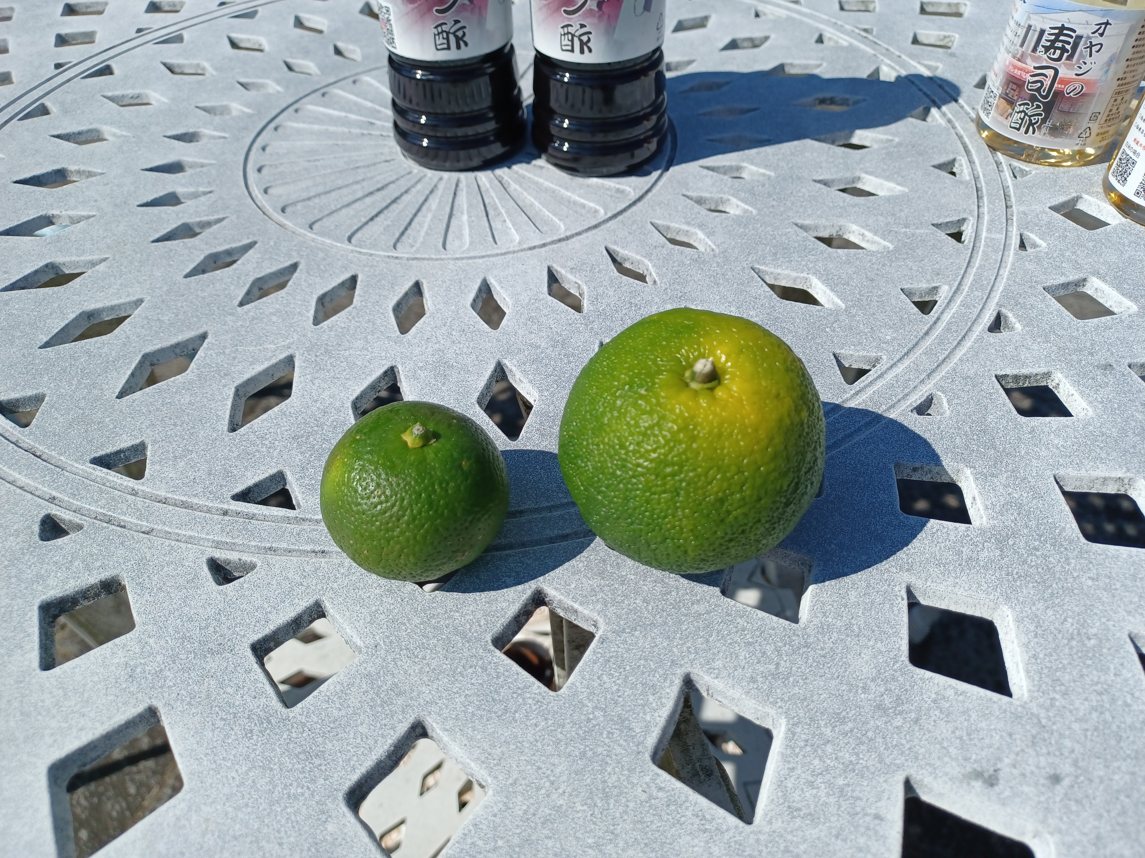 高知の親戚に送ってもらいました(ありがとー)右が「ぶしゅかん」左が「すだち」です。並べてみたら一目瞭然ですね。