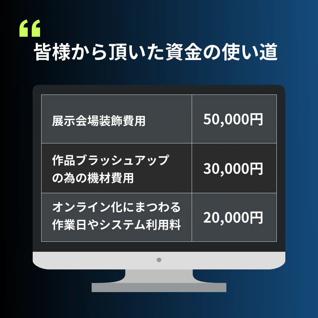 ①例年以上に完成度の高い展示会をより多くの人に届ける為の資金(感染予防対策等含む)