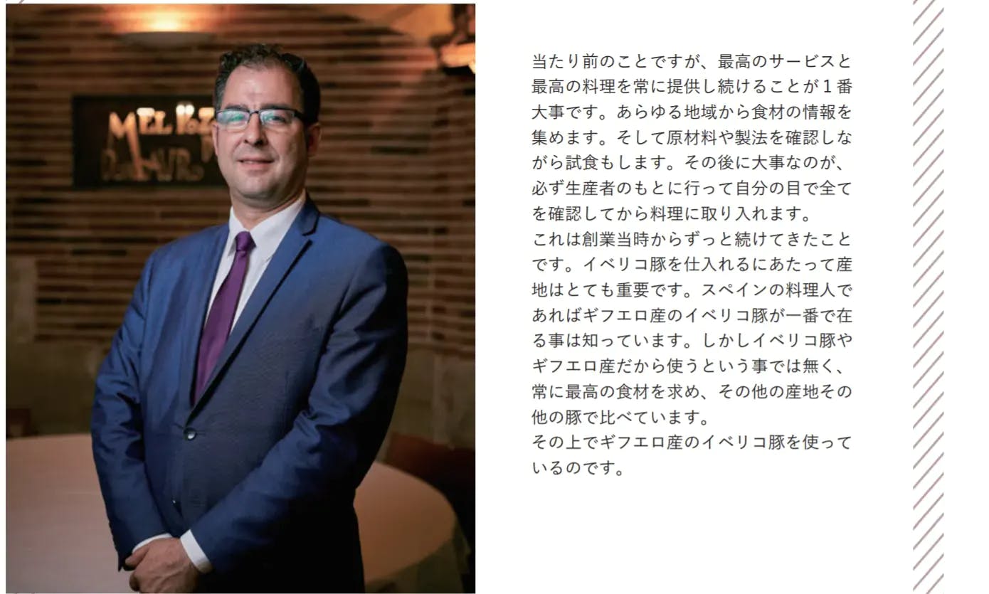 「初めて会った時のことは今でもよく話します。私自身日本には何度も行ったことがあり大好きな国です。日本にはほんとに多くの食が流通しており、その中でも私たちのイベリコ豚を美味しいと言って訪れてきてくれたことはすごい感動でした。何度もスペインに来て、常に新しい情報を知ろうと何年も続けている姿勢は本当に驚かされます。彼らは最先端の日本の知識とスペインの情熱を併せ持った私たちの兄弟です。日本の消費者が求めることは10年後スペインの消費者が求める姿であると私は考えています。今回のコロナでスペインは大きな影響を受けています。しかし、私たちのイベリコ豚生ハムのファンは必ず待っていますので、全力で美味しい生ハムを作り続けます。」