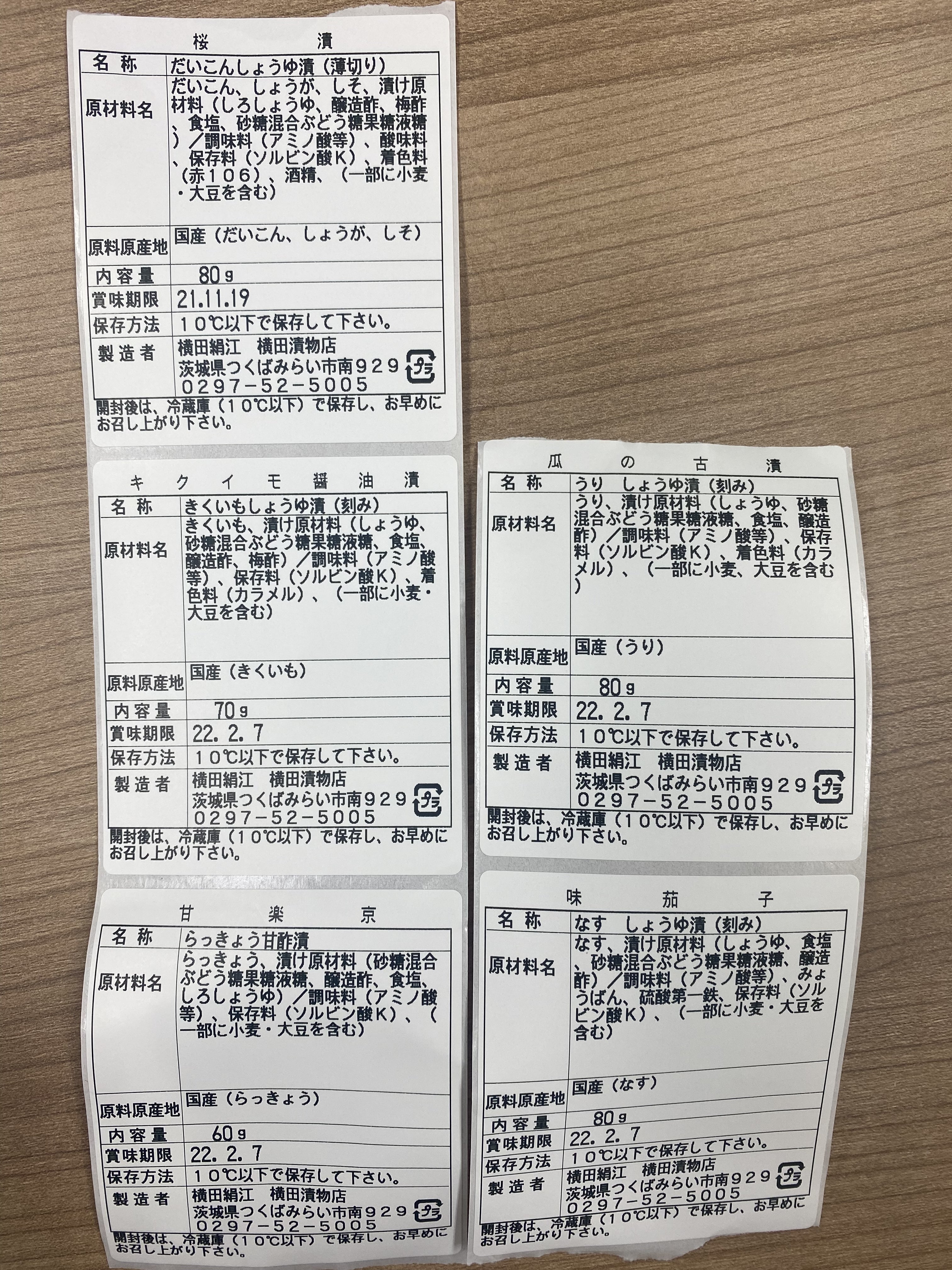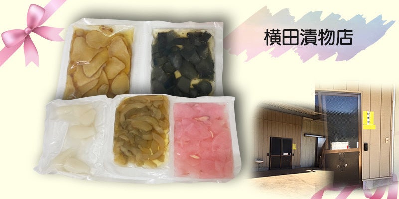 ・横田漬物店 漬物セット(左上から、らっきょう甘酢漬け、うりしょうゆ漬け、大根しょうゆ漬け、きくいもしょうゆ漬け、なすしょうゆ漬け)