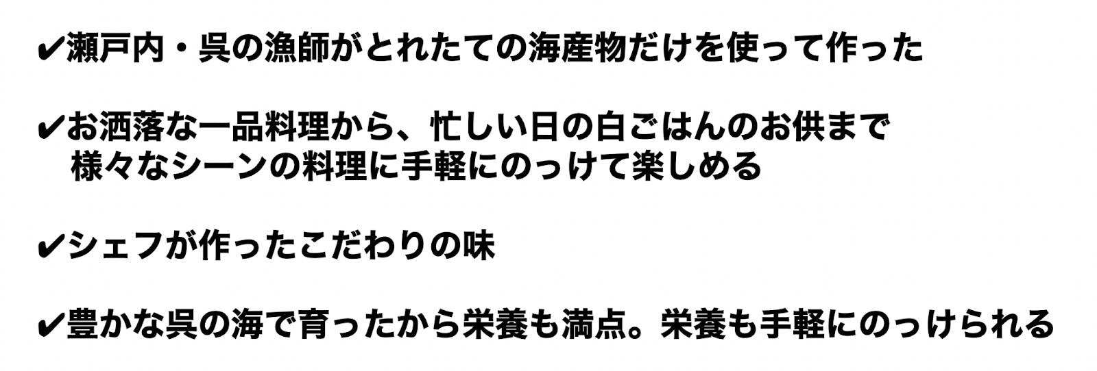 手軽にしらすを暮らしに取り入れやすい商品をつくることで県の枠を超えて呉のしらすを知って、食べていただくことを目指しました。