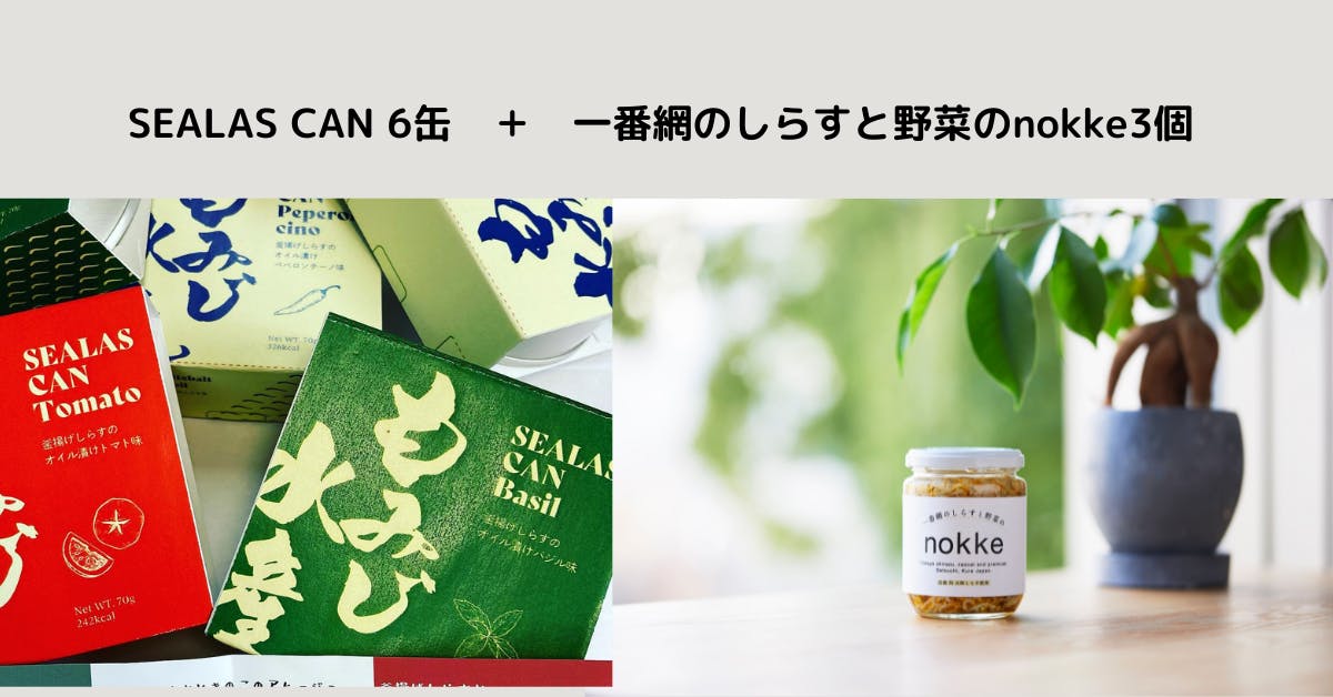 予想よりはるかに上回る人気ぶりで、在庫を切らしたほどの「SEALAS CAN(釜揚げしらすのオイル漬け)3缶と、一番網のしらすと野菜のnokke3個+お礼のメッセージのセットです。
