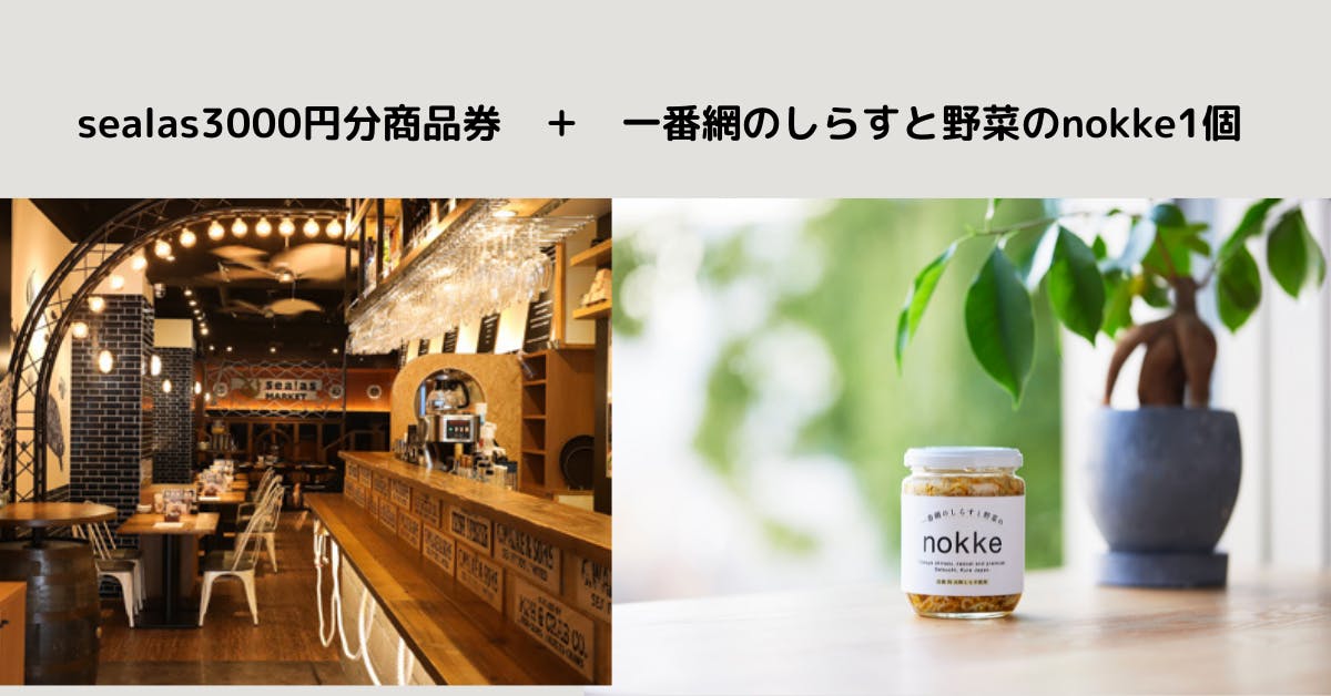 しらす専門店SEALAS 、SEALAS FACTORYでご利用いただける3000円分の商品券と、一番網のしらすと野菜のnokke1個+お礼のメッセージのセットです。