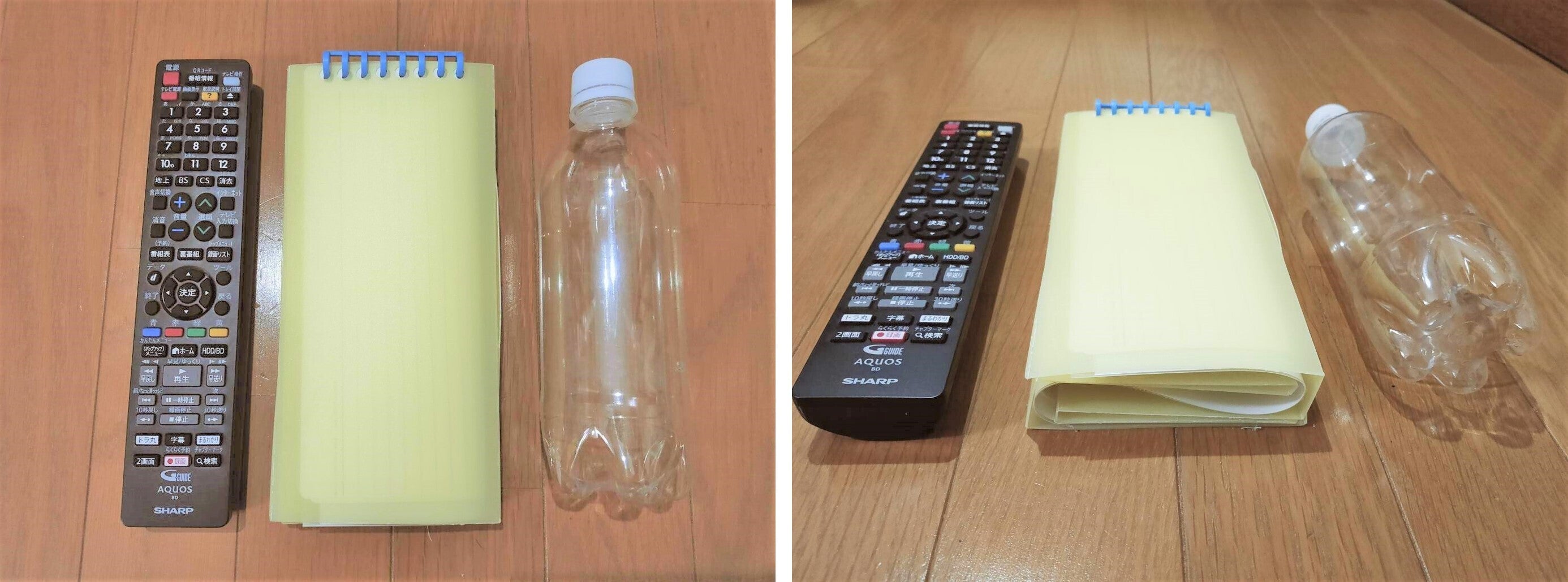 折り畳んだ時の大きさを、テレビのリモコンや500mLのペットボトルと比べてみました。