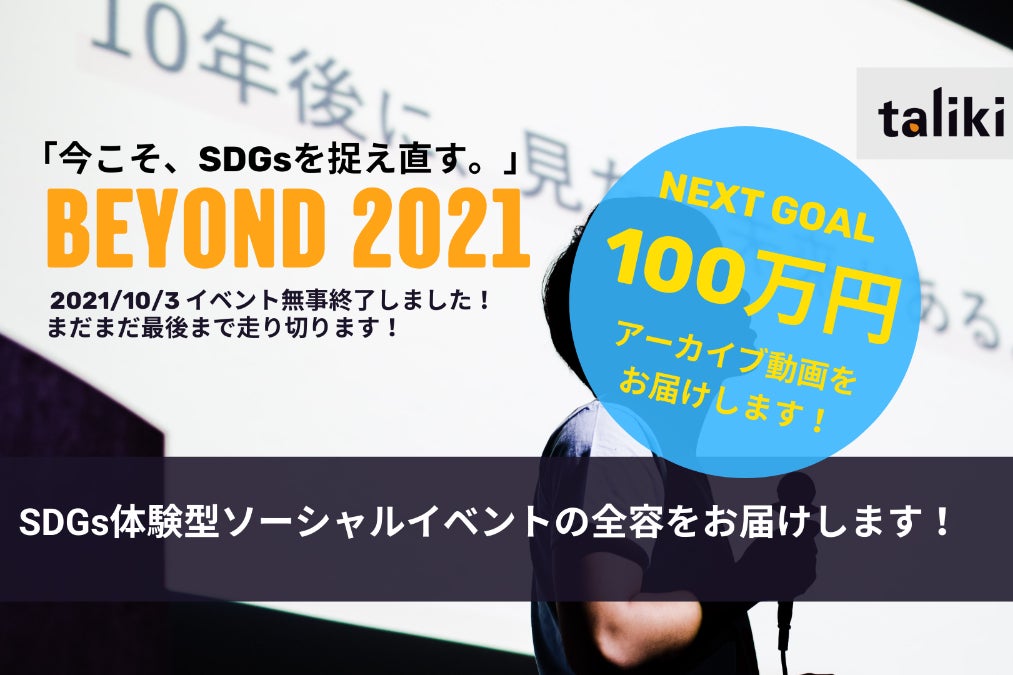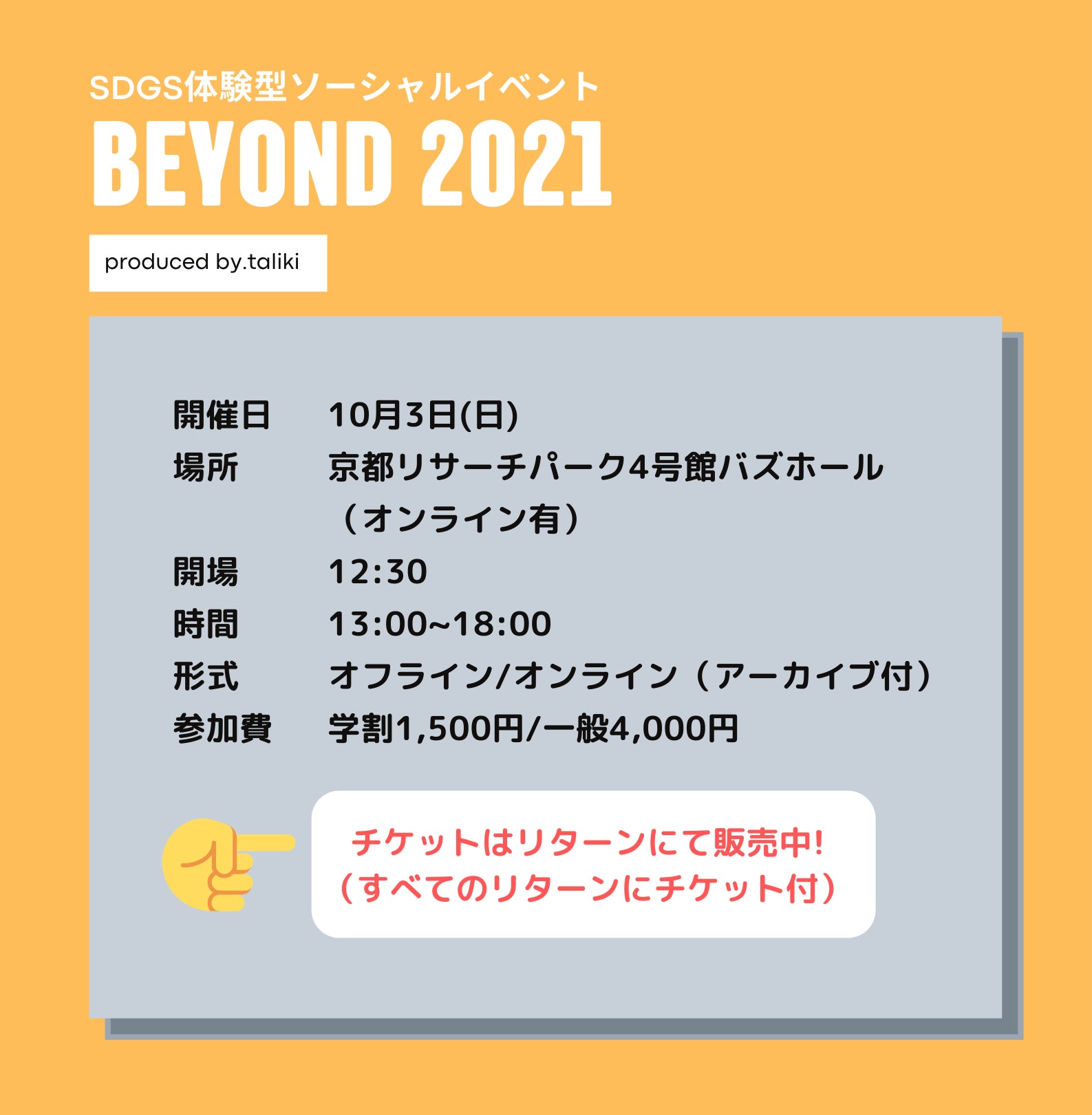 「BEYOND2021」は、社会課題解決に取り組むプレイヤーを支援する株式会社talikiが主催する京都発のソーシャルイベントです。過去4回開催し、のべ1000人の方に参加していただきました。今回は「SDGs」をテーマに多様なバックグラウンドの人と集まり、次の未来についてともに考えていきます。