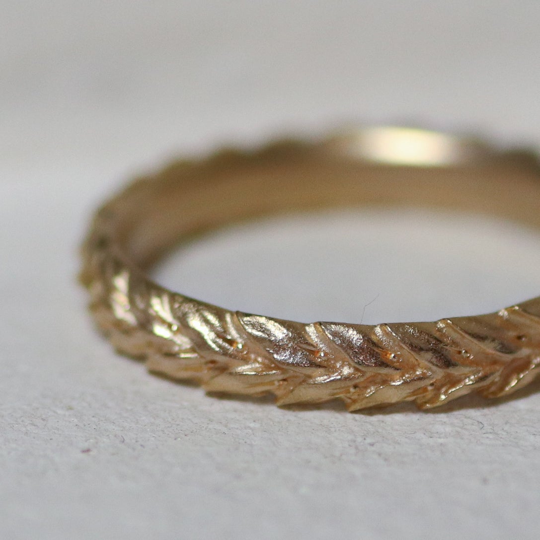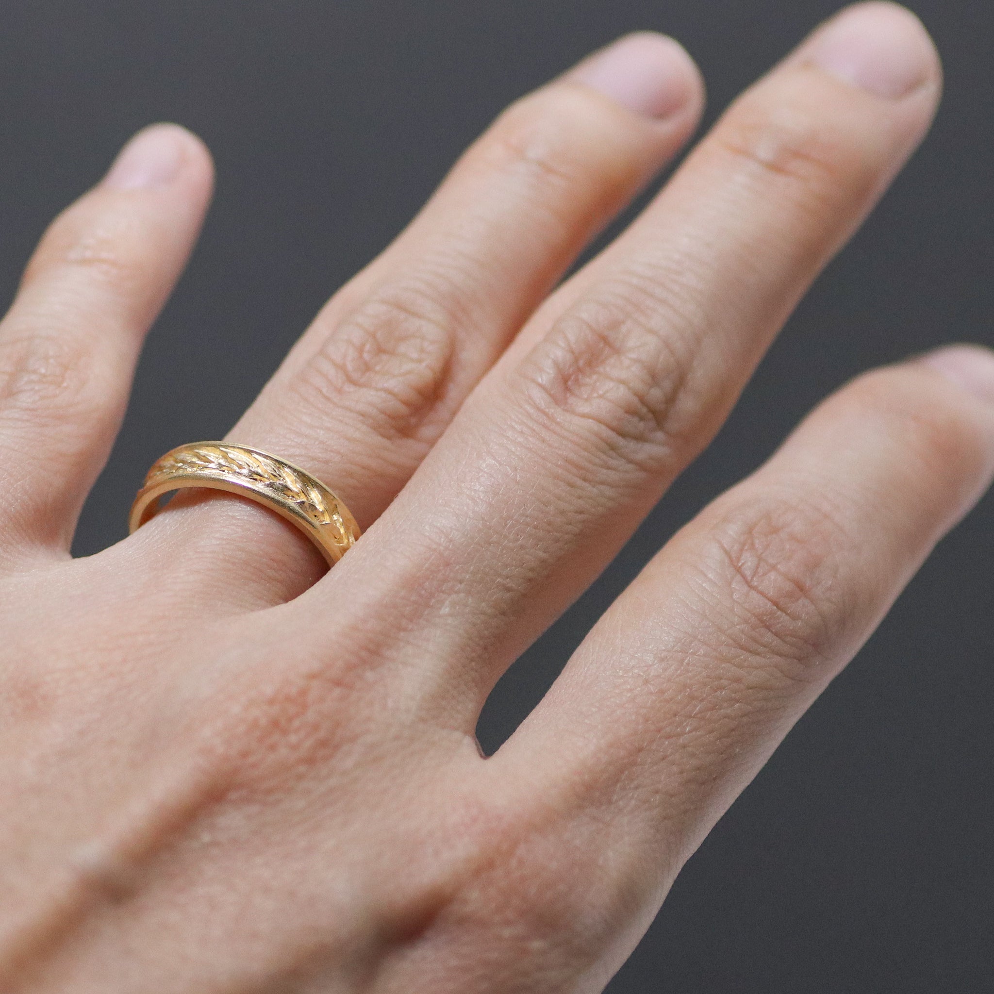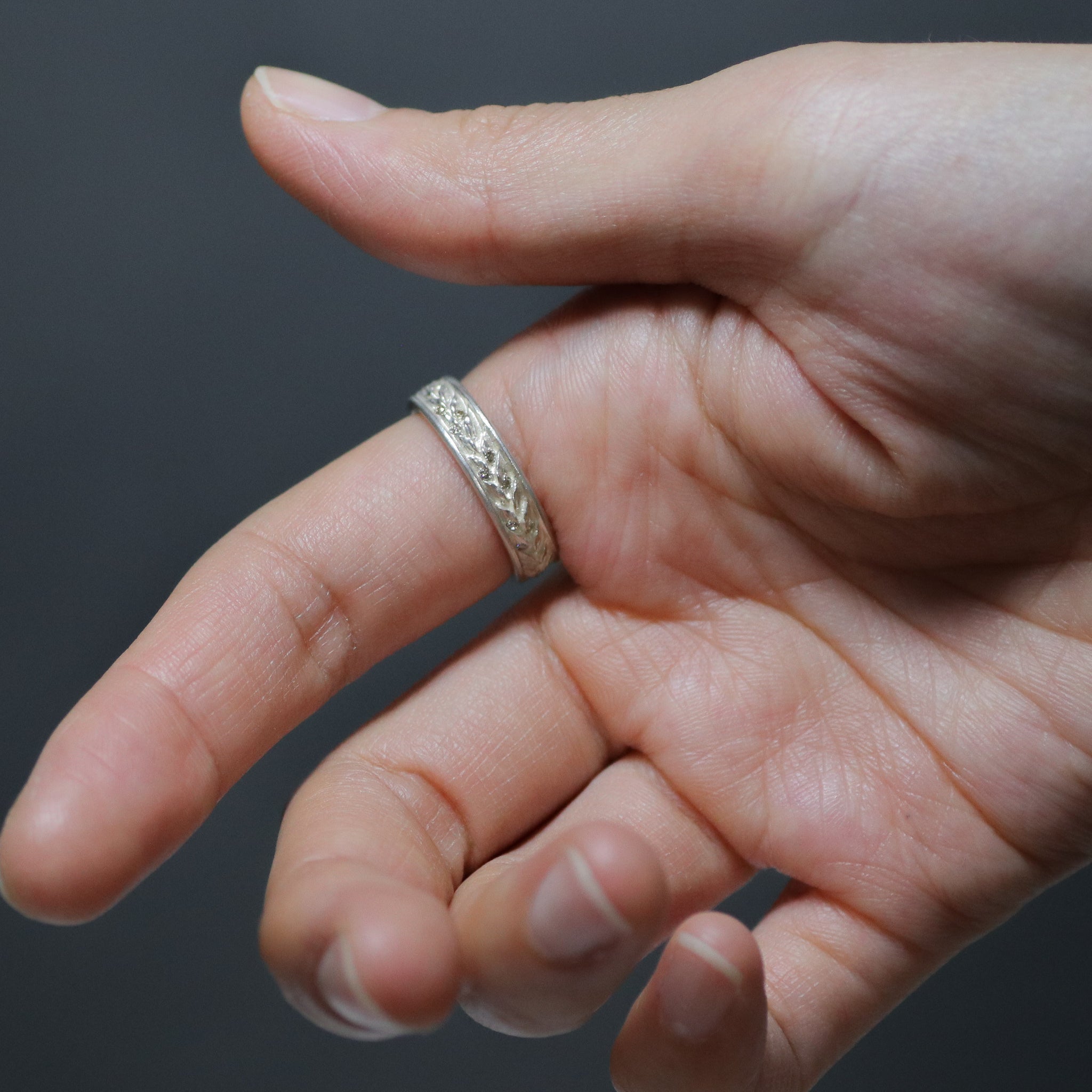 無垢の葉には1枚1枚に洋彫りでラインを彫り、付け根にはミル打ち(丸飾り)を