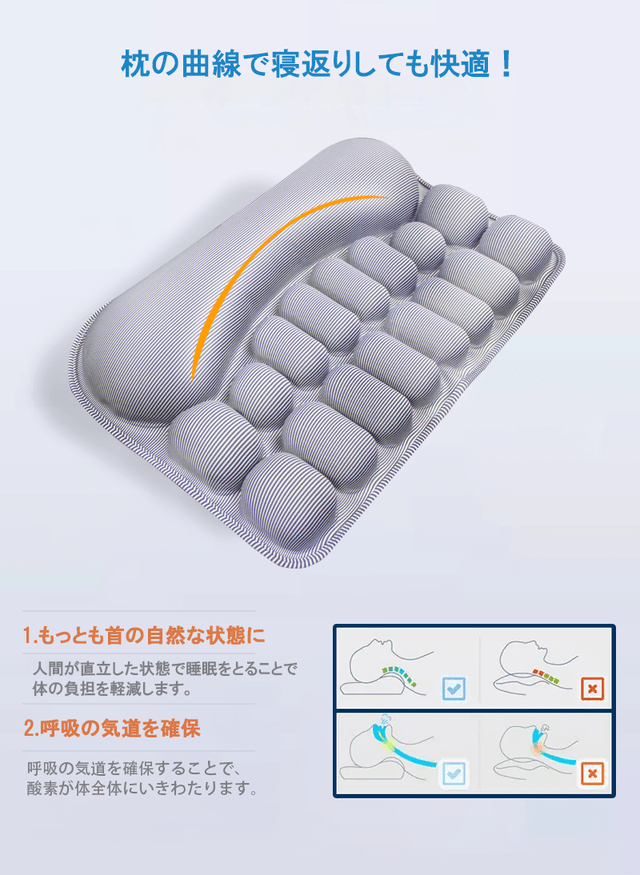より気持ちよい睡眠を得られるよう、首から体の形を研究し、枕の曲線とエアセル一つ一つの大きさを計算し作成しました。なるべくどんな体勢でも睡眠の邪魔にならないように開発しています。