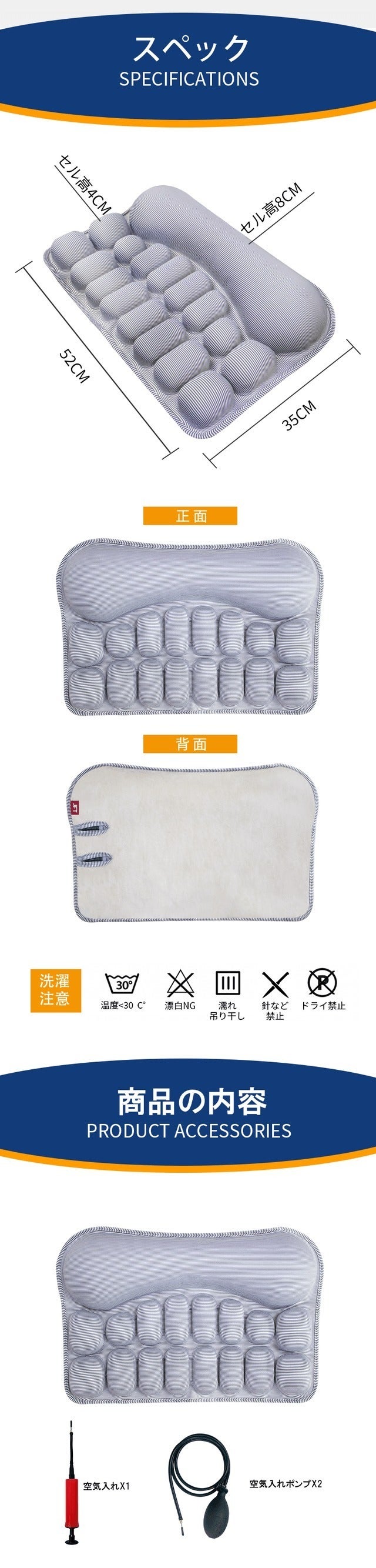 人間の体のラインを研究つくし、人間が健康的な睡眠をとれるように制作した、エアセル枕です。睡眠で枕として使用するのはもちろんのこと、腰のクッションや、デスクワークの時に使う椅子の背もたれ、ヒップクッションとして使用するのもおすすめです!