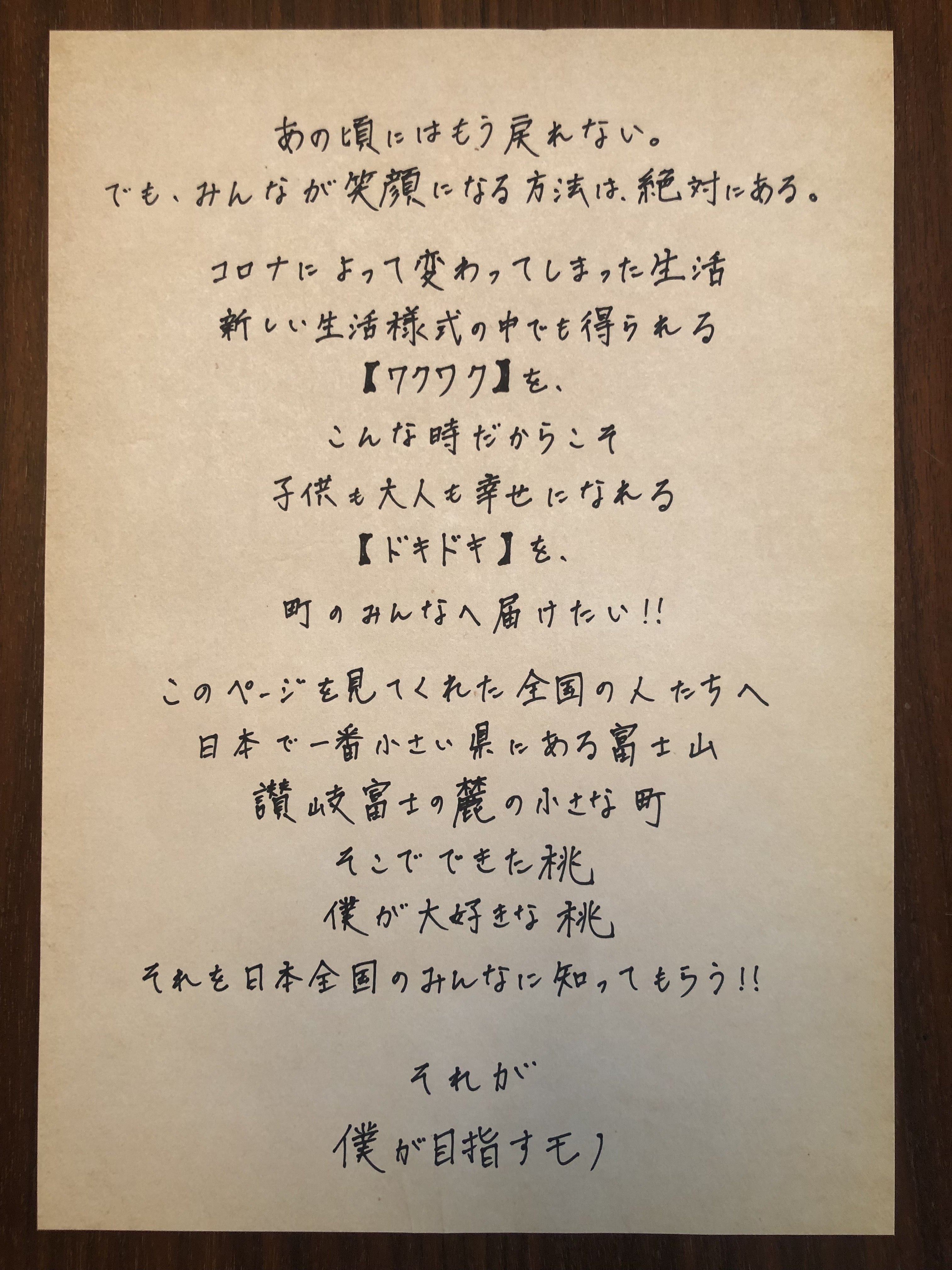 2021/12/14 11:30クラウドファンディング終了は12月15日23:59です!もう残り1日になりました!なんかあっという間でした。。本当に沢山の方からの支援に感謝しています!沢山の方が僕とじいちゃんのことを応援してくださいました!!今日は、クラウドファンディングで集まった応援の声の一部を紹介させてください。読んでいて涙が溢れて仕方がありませんでした。私達皆んながじいちゃんと約束したんだと、思いました。じいちゃんも一緒に皆んなで笑いあえる日が来ますように応援しています!頑張ってください!文章を読んで感動しました。コロナで町の様子も変わってしまったのですね〜 じいちゃんの言葉を、気持ちをずっと忘れなかったアナタは、素晴らしい!! 私71歳、果物大好き!!素敵なお話に心を揺さぶられました。どうか、頑張ってください。美味しい桃、楽しみにしております(*^-^*)こんな応援が集まり、こんなにも多くのひとから応援してもらい、応援の力の凄さを感じています。こんなにも沢山の人に応援してもらうのは人生で初めてです。現在支援者の数は123人!!ここでは紹介しきれませんが、全部読まさせてもらっています。最後1日ですが、僕とじいちゃんのことを。飯山町の桃のことを。最後までどうぞよろしくお願いいたします!! もっと見る第9話『クラウドファンディングに挑戦して分かったこと』
