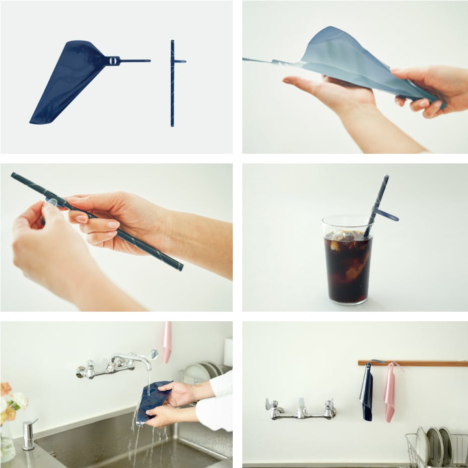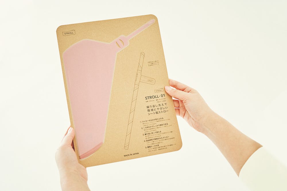 1枚のシートをくるくると巻いてつくるシート製ストロー「STROLL_01」は、素材はプラスチックですが、使い終わったら広げて洗って繰り返し何度も使用することができます。