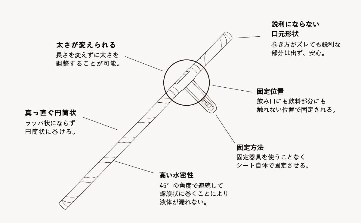 巻き終わったら最後にミシン目に沿って「持ち手部分」切り離すことにより、ストローの飲料に浸かる部分と口元部分を一切触らずに最後まで衛生的に巻くことが可能となりました。