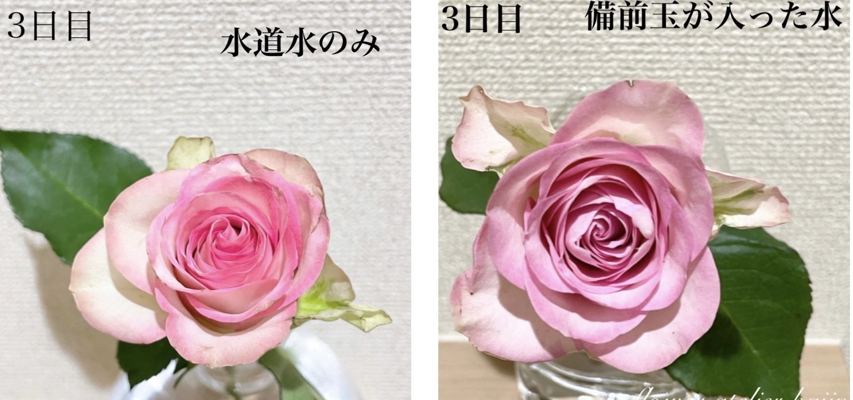 日々応援いただきありがとうございます。先日から生花を使って水道水に備前玉を入れ切り花を生けた状態と水道水のみで切り花を生けた状態ではどのような変化になるか1日毎に画像におさめる作業を開始しました。3日目の切り花の状態①水道水のみ②水道水と備前玉今後とも応援、シェアよろしくお願い致します。