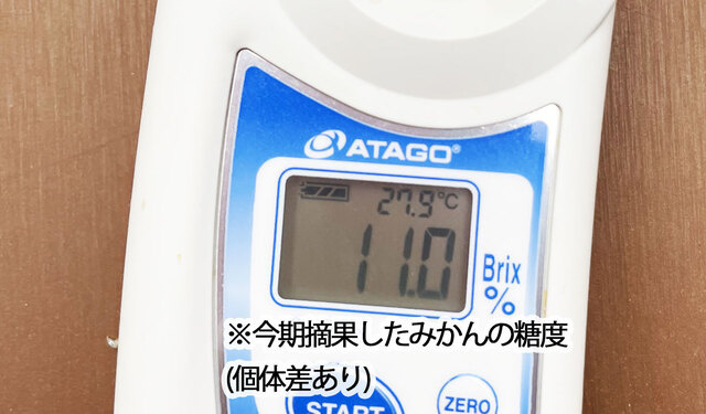 今期摘果した極早生みかんは11度前後(多少個体差あり)です。摘果(てっか)とは、木にたくさんなりすぎた果実を、摘み落とす作業です。この作業を怠ると、全体的に小ぶりになったり、味や質が落ちたりします。