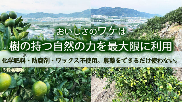 ただ、できるだけ農薬を使わずおいしく育てるために、それに代わる独自の方法で日々試行錯誤しています。その方法は、私たちが農園に毎日足を運び、1つ1つの樹を観察する事で可能になります。長年の経験と、樹の持っている自然の力を最大限に利用する事で、美味しいみかん作りを心掛けています。