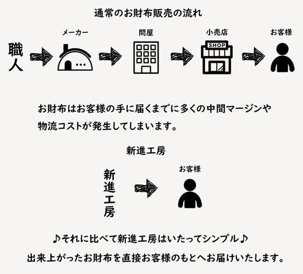 お財布はお客様の手に届くまでに多くの中間マージンや物流コストが発生しています。それに比べて新進工房の仕組みはシンプルです。
