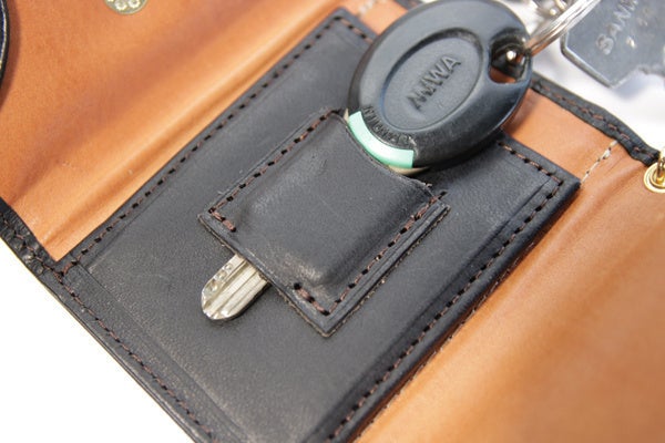 上部にハトメとキーリングを付けているので鍵も一緒に持ち歩けます。