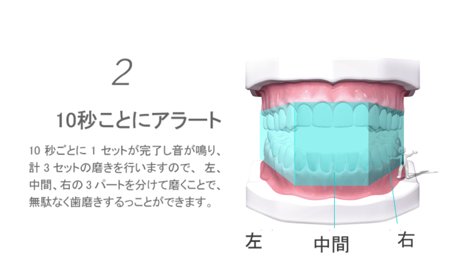 以下のように、3つのパートを分けて10秒ずつ磨きます。10秒ごとに1回お知らせが出ますので、わかりやすいです。