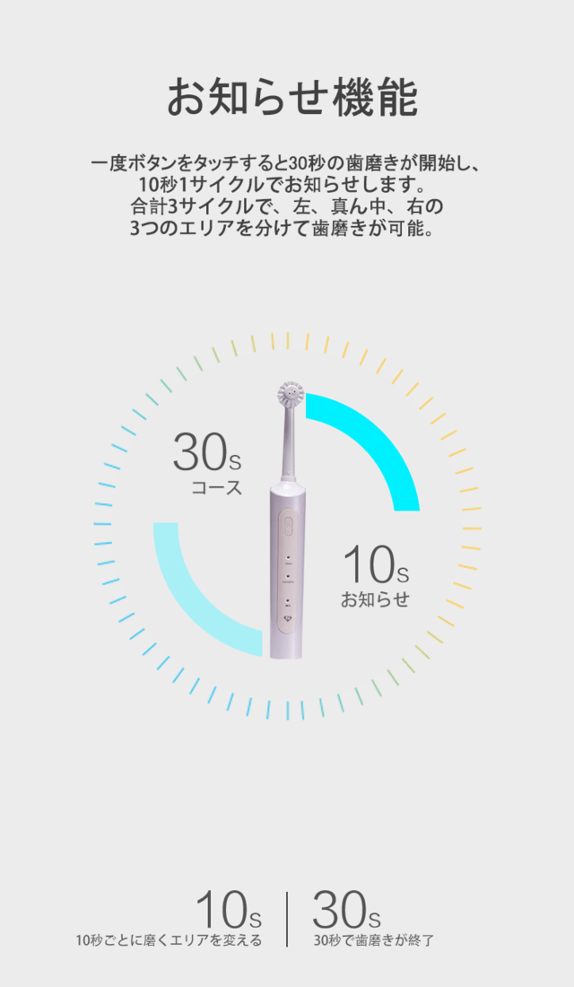 より均一で偏りのないブラッシングを実現するため、5秒ごとにヘッドの回転方向を自動で切り替え!さらに10秒ごとのアラーム機能付きでブラッシングの時間の経過をお知らせします。