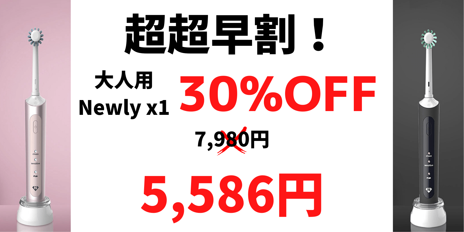 NEWLYは特許取得のブラシヘッドにより、歯の6面を一度に歯磨きできます!歯磨きに必要な時間の目安は最低3分間といわれてますが、特許取得のブラシヘッドにより、歯の6面を一度に磨けるため、「NEWLY」ならたった30秒*で完了!所要時間1/6に!