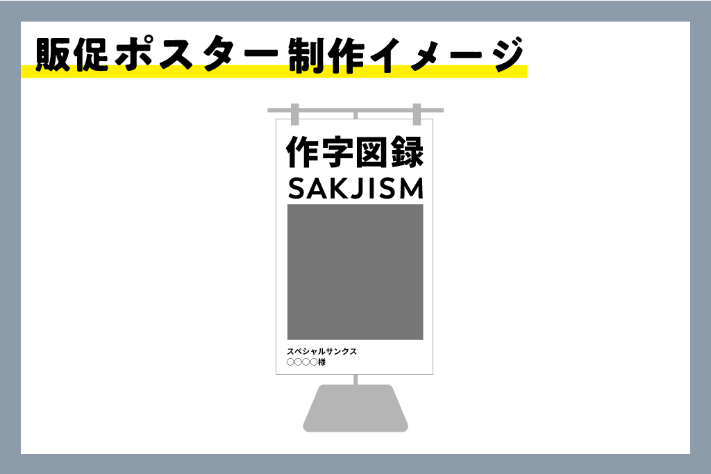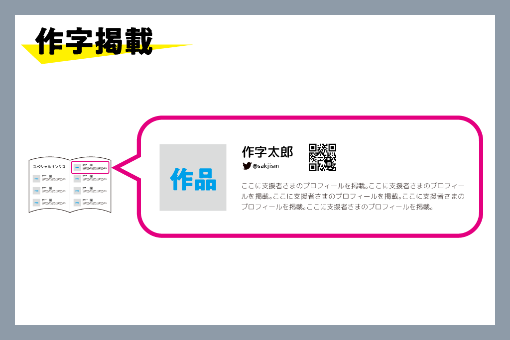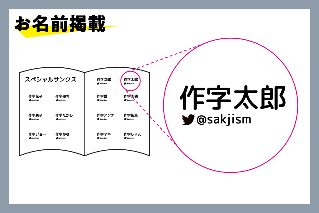 「SAKJISM」という文字列で、皆様の個性を全面に押し出した作字作品を制作いただき、11/24までに所定のメールアドレス宛にデータをご送付ください。本誌のスペシャルサンクスページにて掲載いたします(ご送付いただくアドレスは、当該リターンをご支援いただいた方へ、CAMPFIREのメッセージ機能を利用しお伝えいたします)。