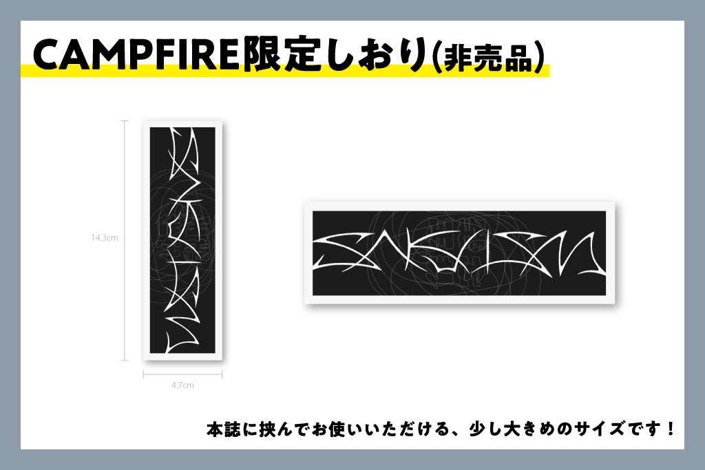 冊子本体の価格の内訳は、本体価格2000円 + 送料300円となっておりますが、お品物のお届けが発生するリターン(冊子・グッズどちらかだけでも可)をご支援いただいた方全員に、タイトルロゴをモチーフにしたしおりを1つ送付いたします。ぜひ本誌に挟んでお使いください。