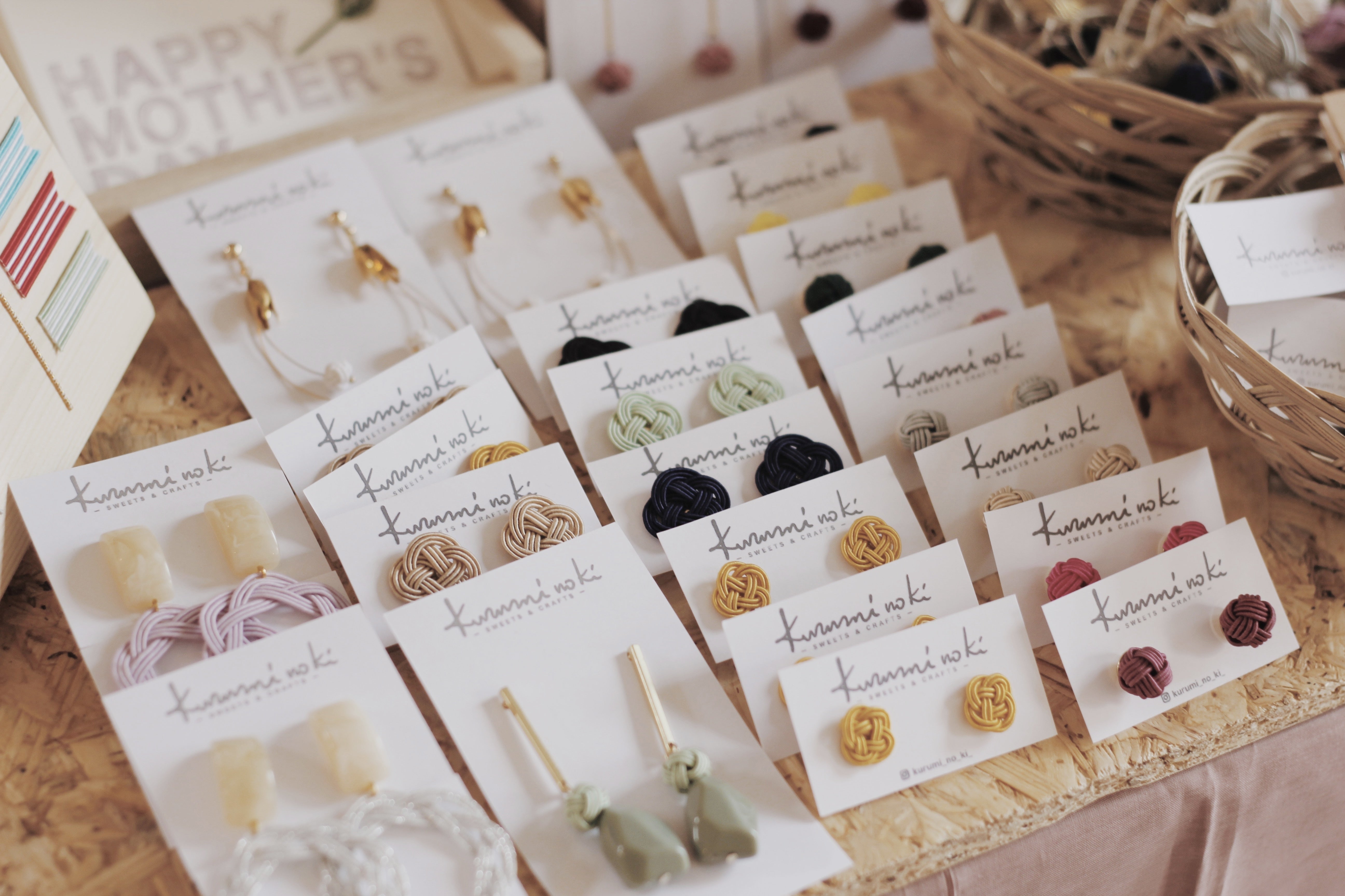 「Kurumi no ki」では店舗開業前の勉強として、水引を使用したアクセサリーの製作・販売を行っております。