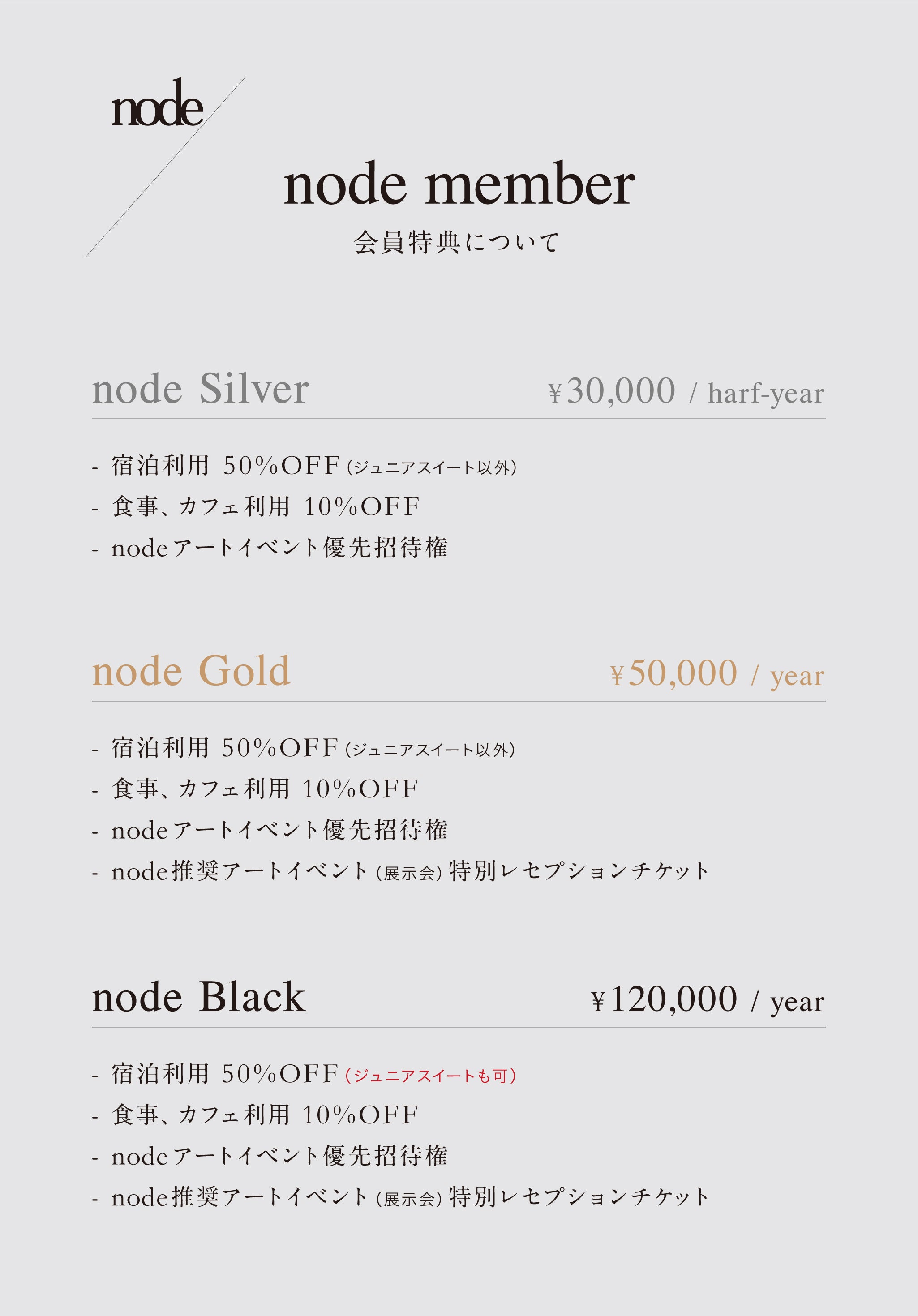 3つのグレード(シルバー|ゴールド|ブラック)に分かれた会員様には、nodeでの宿泊利用が通常レートの50%OFF、食事利用が10%OFFでご利用いただけるだけでなく、よりアートに触れる機会を増やしていただけるよう、nodeにて開催するアートイベントの優先招待、外部アートイベントの特別レセプションチケットの案内をさせていただきます。(※グレードにより特典内容は異なります。下記内容をお確かめの上ご登録くださいませ。)