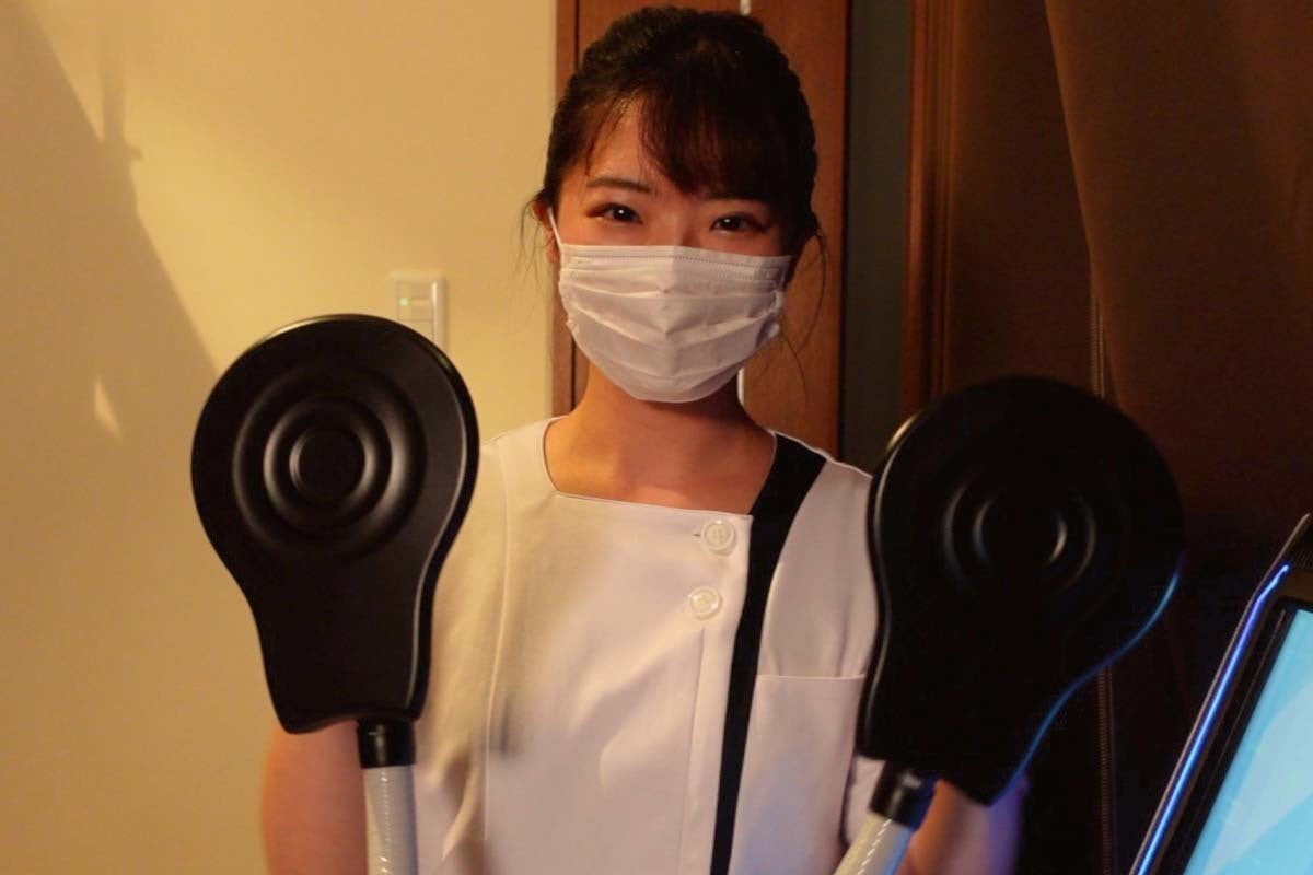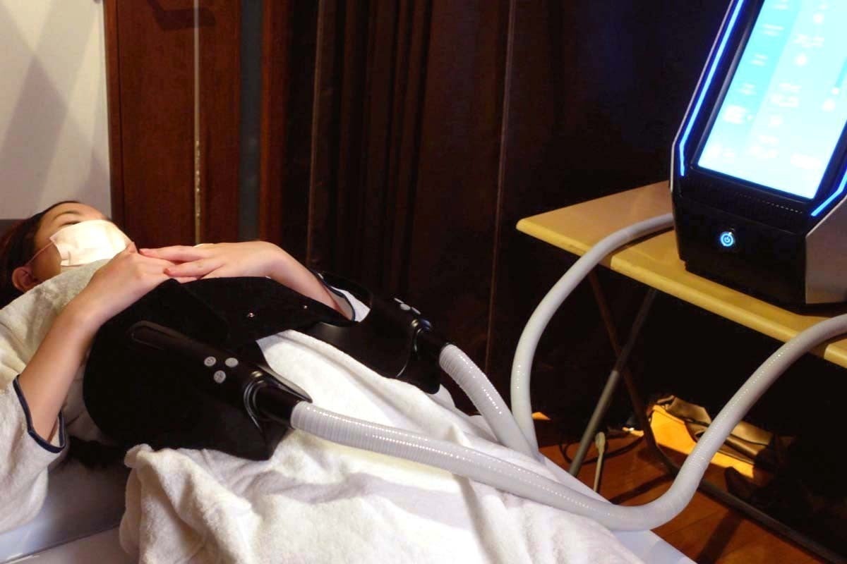 今までの筋刺激をするEMS(低周波マッサ―ジ器)のように、肌を露出して施術する必要はありません。施術したいところに、着衣のまま体にフィットさせるだけで、面倒なセッティングはいりません。