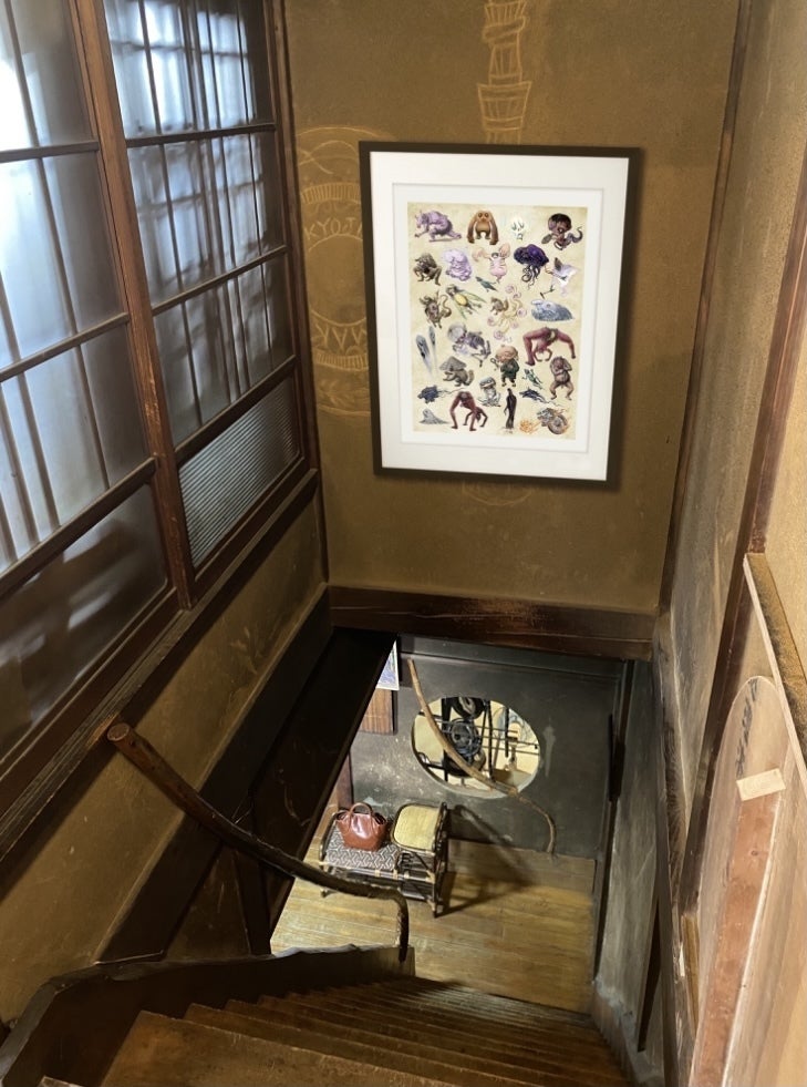 この絵画展は、絵本「怪森の守」のプロモーションはもちろん、古民家に物語の世界観を纏わせ、その部屋がまるで妖怪の研究家の部屋であるかのように構成していきます。