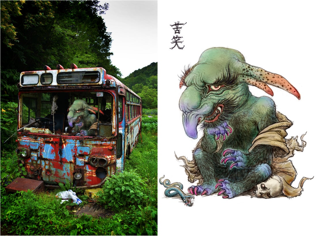 氏の撮った素晴らしい写真と氏の描く、恐ろしくて味わい深い妖怪たちをコラージュし、絵本としても深遠な物語を構築していきます。