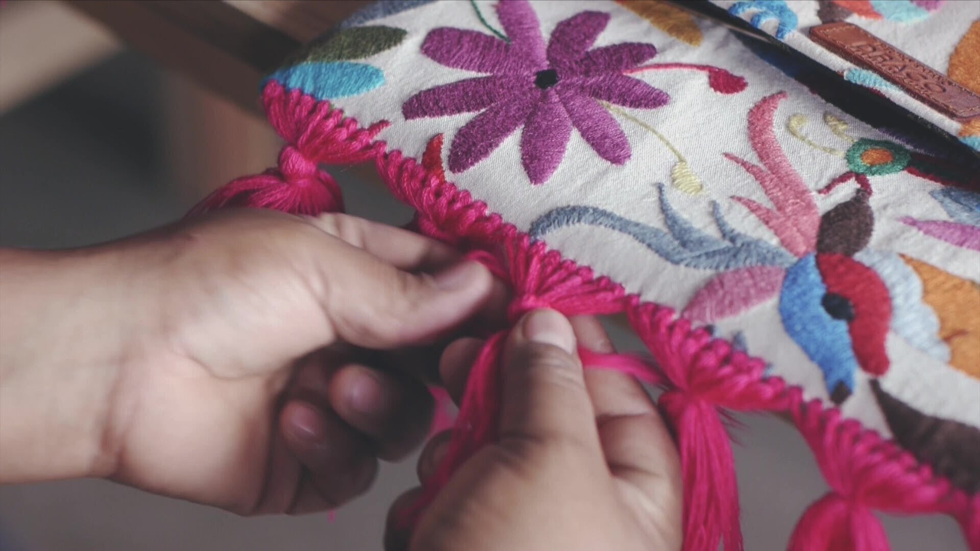 フリンジは、コットンの毛糸1本1本を手で取り付けています。ヨーロッパから伝わった文化と言われ、民族衣装などでも使用されており、メキシコにとってもかなり重要な存在です。