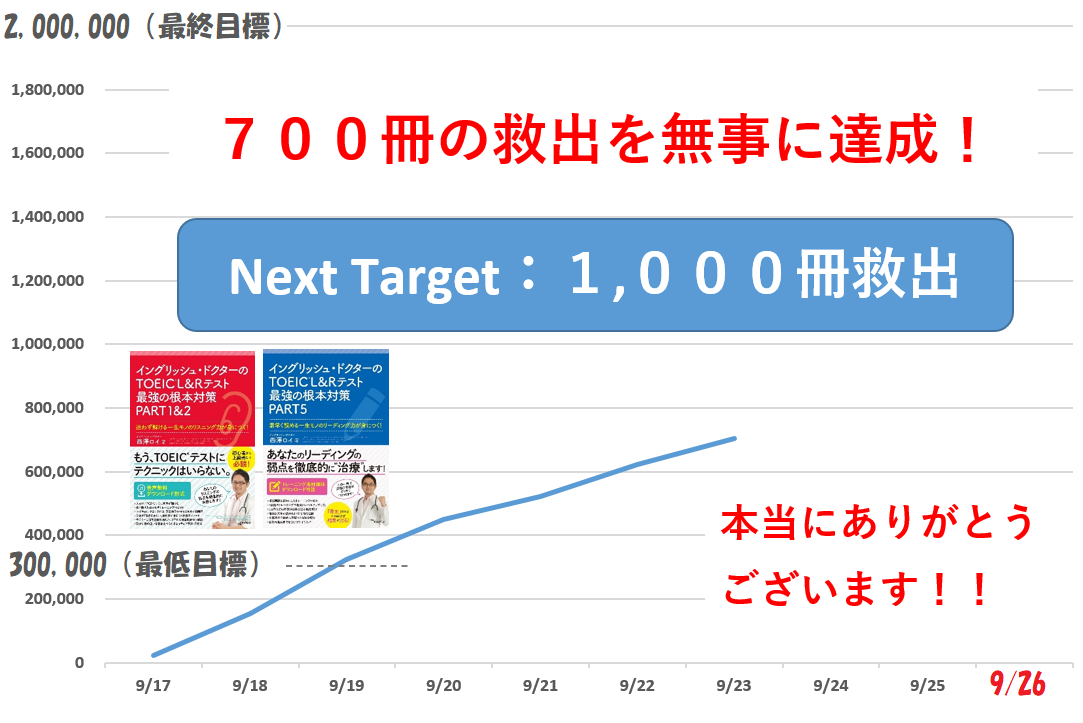 2021/10/01 13:53こんにちは、イングリッシュ・ドクターの西澤ロイです。今日は嬉しいご報告をさせてください。奇跡が起こりました…出版社から来た連絡緊急クラウドファンディングの結果として、目標比368%という結果になり、合計1,400部の救出を行なったことは既にご報告いたしました。今回、書籍が廃棄処分になる期限が9月末だとお伝えしていましたが、9月29日に出版社より、1通のメールが届きました。その題名は・・・「TOEIC対策書籍二冊の断裁取りやめのお知らせ」なんと、今回の取り組みを大きく評価していただけ、断裁処分(廃棄処分)が見送られたのです!元々、約2,000部とお伝えしていましたが、それは詳細が秘匿情報だったためであり、実際には約3,000部が処分対象だったのです。その全てを、皆様の応援、ご協力のおかげで救出することができました。本当に、ありがとうございました!!プレスリリースも出しました(↓)。https://www.atpress.ne.jp/news/278284今夜22時より報告のYouTubeライブをやります本日(10月1日)22時より、今回のクラウドファンディングの経緯や最終結果などについてご報告をさせていただくYouTubeライブをやります。よろしければぜひご覧いただけますと嬉しいです。https://www.youtube.com/watch?v=VBGAM9lfzz8 もっと見る