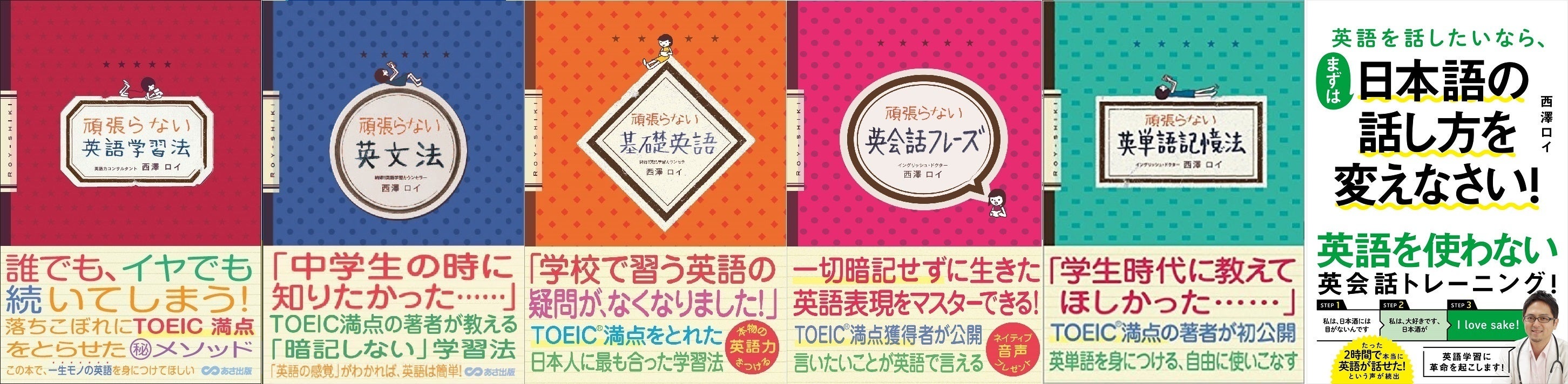 代表作は5万部のベストセラーになっている『頑張らない英文法』(左から2冊目)やその「頑張らない英語」シリーズ(あさ出版) 、また、1年ほど前に出た最新作の『英語を話したいなら、まずは日本語の話し方を変えなさい!』(SBクリエイティブ)(右から1冊目)です。
