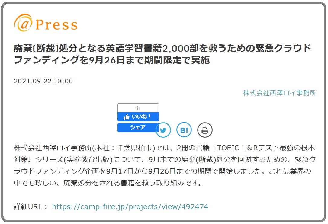 廃棄(断裁)処分となる英語学習書籍2,000部を救うための 緊急クラウドファンディングを9月26日まで期間限定で実施