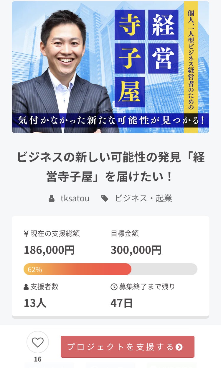 2021/10/29 21:30たくさんの応援とご支援をありがとうございます!今朝8時から始まったクラウドファンディング。たくさんの応援をいただき、目標まで62%達成ができました!まだまだ困っている経営者さんに届けていきたいと思いますので、引き続きよろしくお願いいたします。感謝を込めて。経営者寺子屋塾長 佐藤志憲 もっと見る