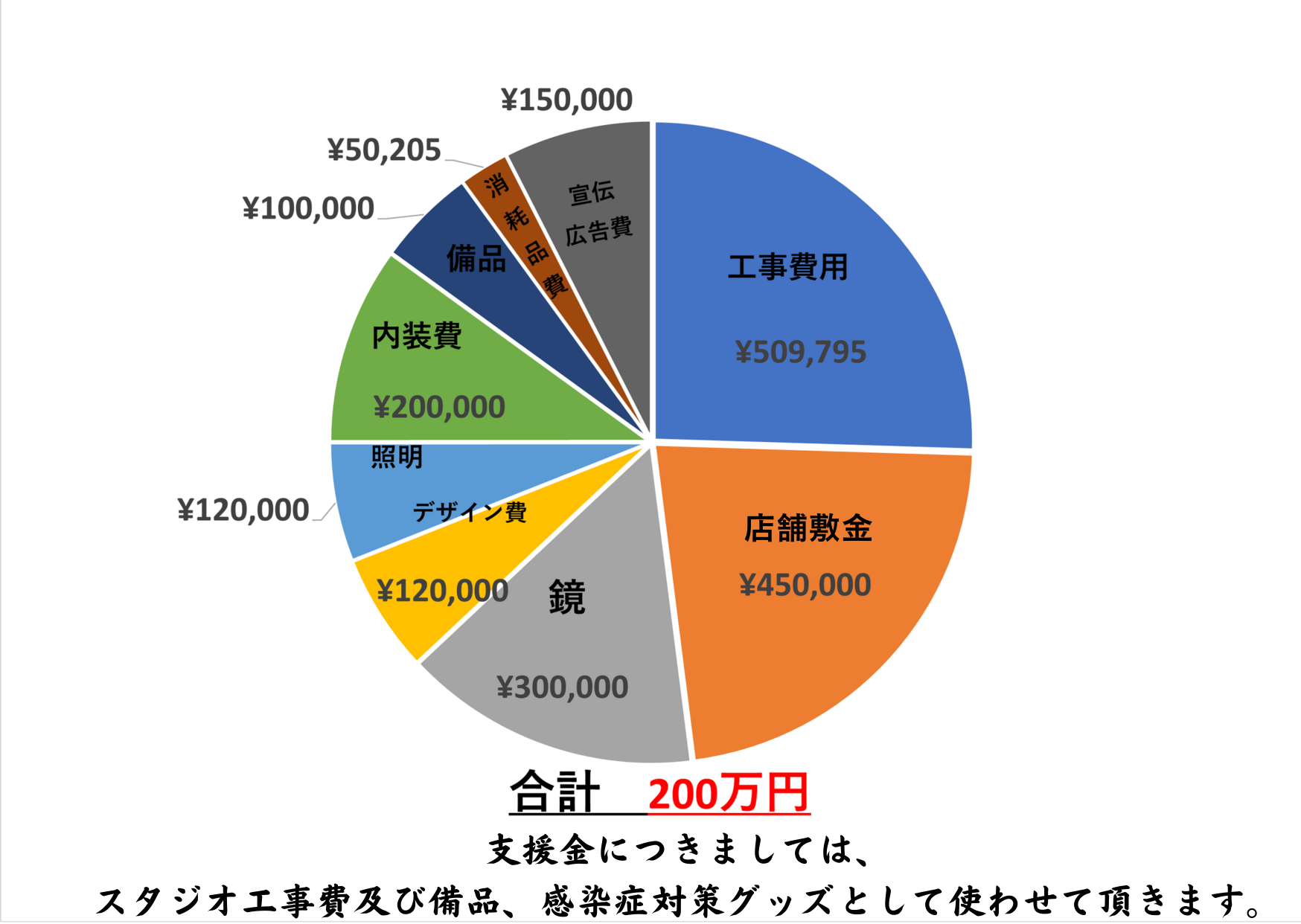 店舗工事費用、スタジオ備品、コロナ対策グッズ、諸経費、CAMPFIREへの手数料、スタジオの運営資金として使わせて頂きます。