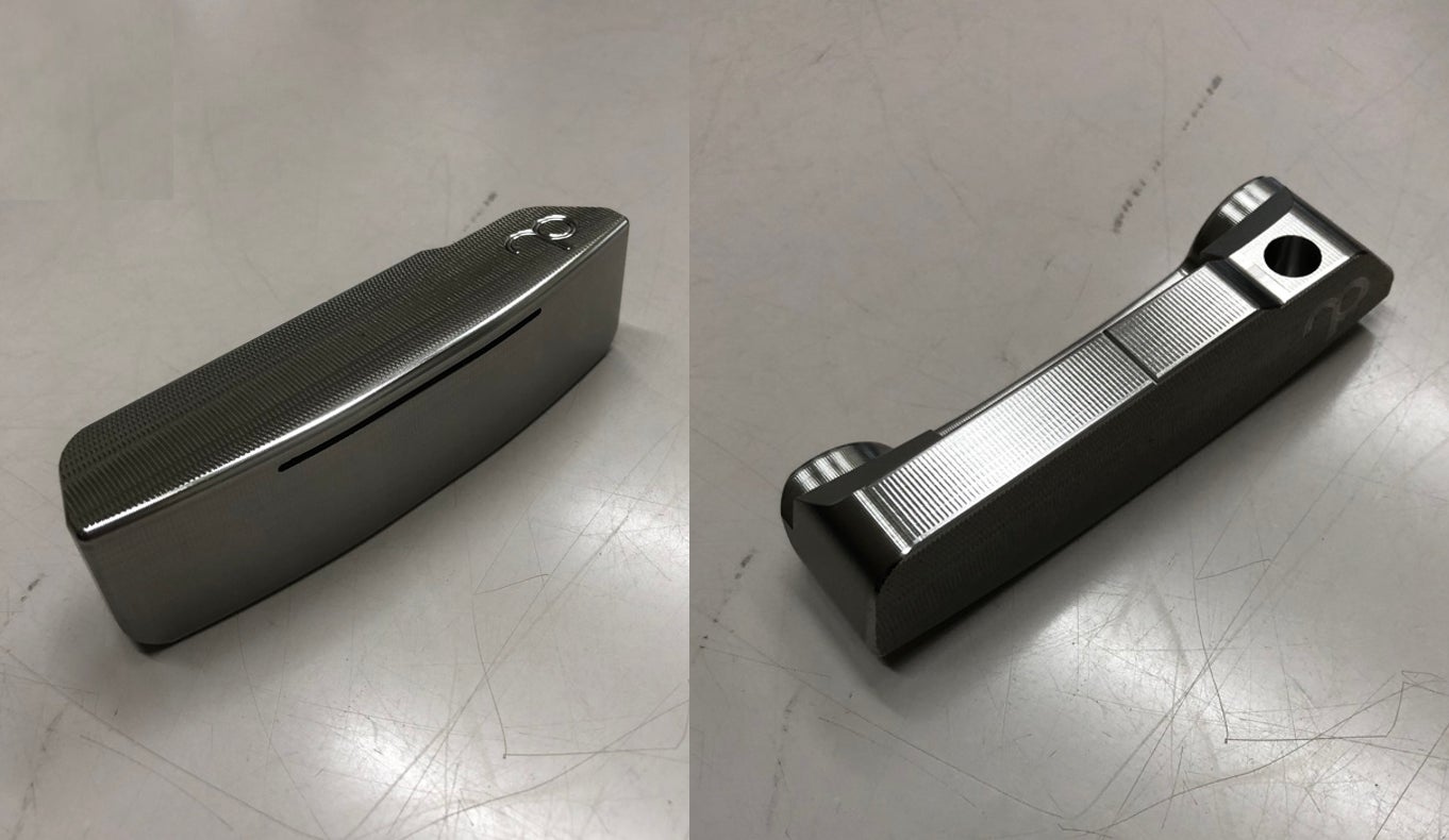 2021/11/15 22:52削り出し直後のNP03(ベントネックタイプ)のパターヘッドです!左の写真はフェース面と底面のアップです。SUS303の素材から「削り出した際の金属の質感」が魅力の一つです。底面にある「スリット」がNP03シリーズの独特の打音を実現しています。是非とも皆さんに体感していただきたい一品です^_^ もっと見る